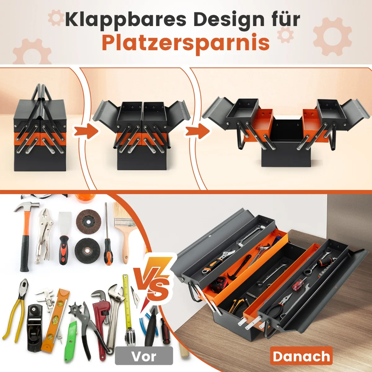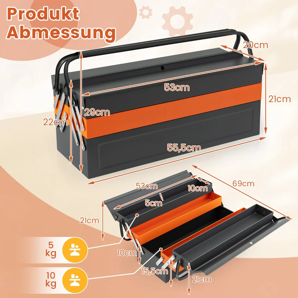 Įrankių dėžė 69×55,5x29cm tamsiai pilkos ir oranžinės spalvos yra praktiškas sprendimas įrankių saugojimui įvairiose dirbtuvėse, garažuose ar sandėliuose. Ši 5 skyrių dėžė leidžia tvarkingai išdėstyti skirtingus įrankius ir užtikrina patogų pervežimą.