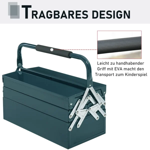 Su šia praktiška DURHAND įrankių dėže įrankiai visada bus po ranka. Trys lygiai ir penki skyriai suteikia daug vietos įrankiams, mažoms dalims ir priedams. Įrankių dėžė pagaminta iš aukštos kokybės plieno, kuris nerūdija ir yra atsparus įbrėžimams. Dėl nešiojimo rankenos įrankių dėžę galima lengvai transportuoti. Dirbtuvėms, garažui ar sandėliui – šios DURHAND įrankių dėžutės neturėtų trūkti jokiame statybos projekte!