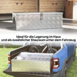 Beveik gėda joje laikyti tik įrankius: ši transportavimo dėžė, pagaminta iš languotos HOMCOM plokštės, tinka amatų reikmenims, mažiems sodo įrankiams ar vaikiškiems žaislams. Jis pagamintas iš aliuminio ir turi dvi rankenas. Jį galima naudoti kaip mobilią įrankių dėžę arba stacionariai sumontuoti jūsų transporto priemonėje. Siekiant apsisaugoti nuo vagystės, erdvioje aliuminio dėžėje yra įmontuota spyna su dviem raktais.