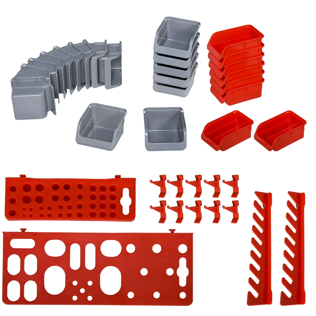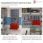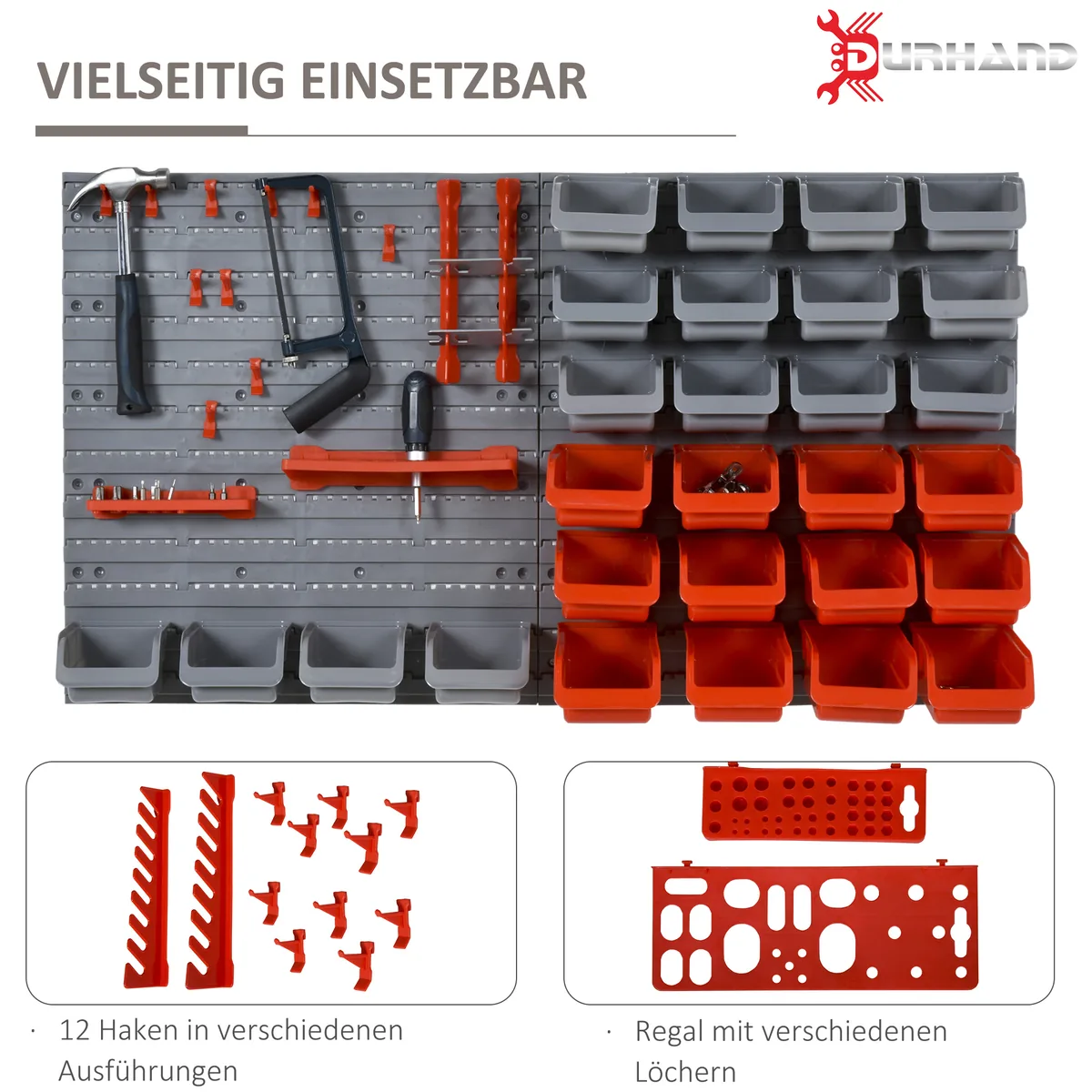 Ši didelė, 44 dalių DURHAND įrankių sienelė leidžia sutaupyti vietos ir gerai surūšiuoti jūsų įrankius ir daugybę smulkių dalių. Nuimamose ir sukraunamose dėžutėse yra daug vietos varžtams ir kitoms mažoms detalėms. Įrankio sienelę galima montuoti horizontaliai arba vertikaliai ant sienos, taip sutaupant daug vietos grindų. Pagaminta iš itin stabilaus plastiko, ši įrankio sienelė gali atlaikyti iki 30 kg bendrą svorį.