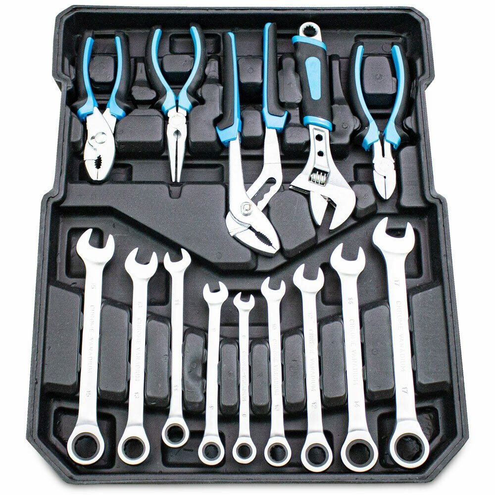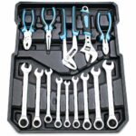 Komplektacija: Replės ir žiediniai veržliarakčiai: 1x įstrižinės replės 180 mm, 1x reguliuojamas veržliaraktis 200 mm, 1x siurblinės replės 230 mm, 1x adatinės replės 180 mm, 1x slankiojančios replės 150 mm, 9x reketinės žiedinės veržliaraktės 20,1,1,1 ,13,14,15,17mm. ;
