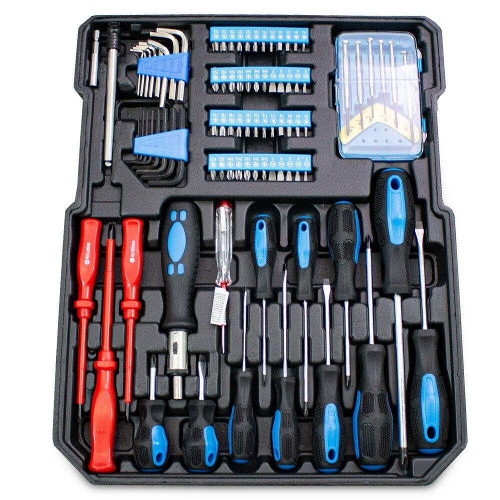 Antgaliai, šešiabriauniai raktai ir atsuktuvai: 6x tikslūs atsuktuvai: (-) 1,4, 1,8, 2,4, 3,0 mm, (+) #0, #1, 16 x 1,5 šešiabriauniai raktai -10 mm, 48x antgaliai: PZ.1-PZ. 7, V.2-V.7, PH.3-PH.6, T.10-T.40, H0-H4, AD, 1x Atsuktuvas su antgalių laikikliu, 1x antgalių laikiklis, 14x atsuktuvai: (-) 3x75mm, 4x100mm, 5x75mm, 6x38mm, 6x100mm (+) 3x75mm, 4x100mm, 5x75mm, 6x38mm, 6x100mm, 8x150mm Izoliuotas: (+) ratukas, rašiklis, 100 mm.