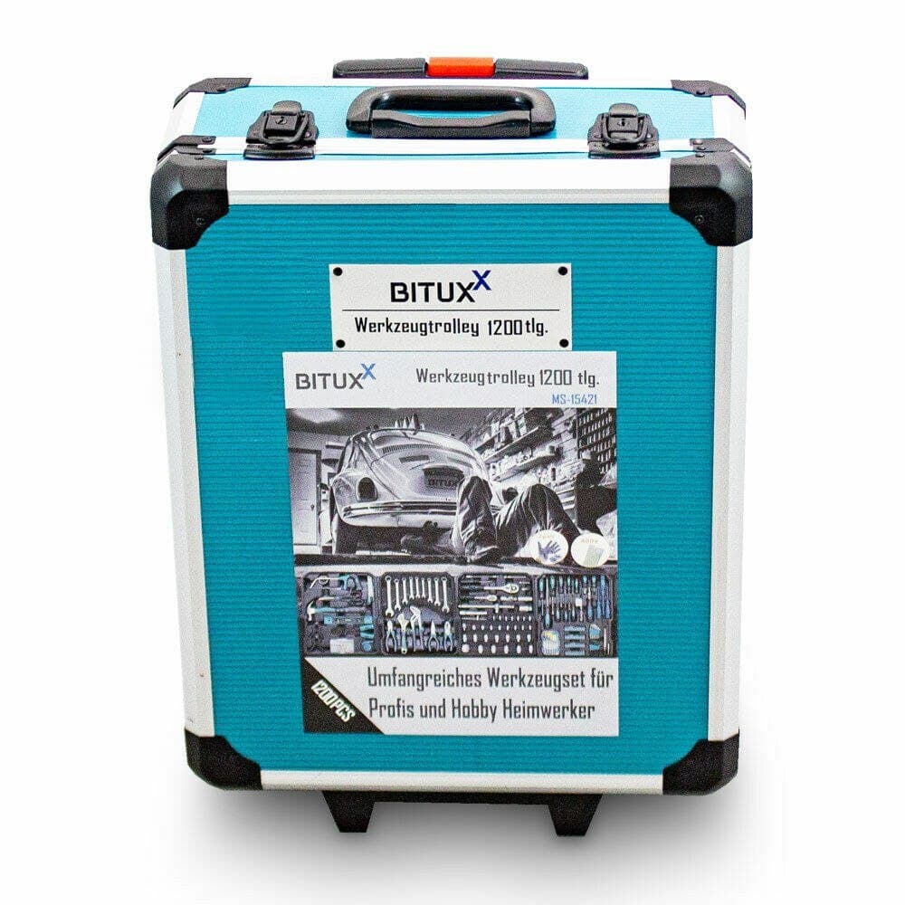 ĮRANKIŲ DĖKLAS SU PRIEDAIS 1200 Elementų ; Vertinamo vokiško prekės ženklo BITUXX įrankių rinkinys – gaminys, kuris turėtų būti kiekviename garaže ar dirbtuvėje! Į patogų, talpų lagaminą ant ratukų telpa net 1200 daiktų, o dėl teleskopinės, ištraukiamos rankenos ir ratukų jį puikiai nešiotis ir galėsite pasiimti kur tik norite! Įrankiai išdėstyti keturiose skaidriose, išimamose talpyklose, kurių dėka labai greitai ir lengvai rasite norimą įrankį. Įrankiai pagaminti iš aukštos kokybės chromo vanadžio plieno.