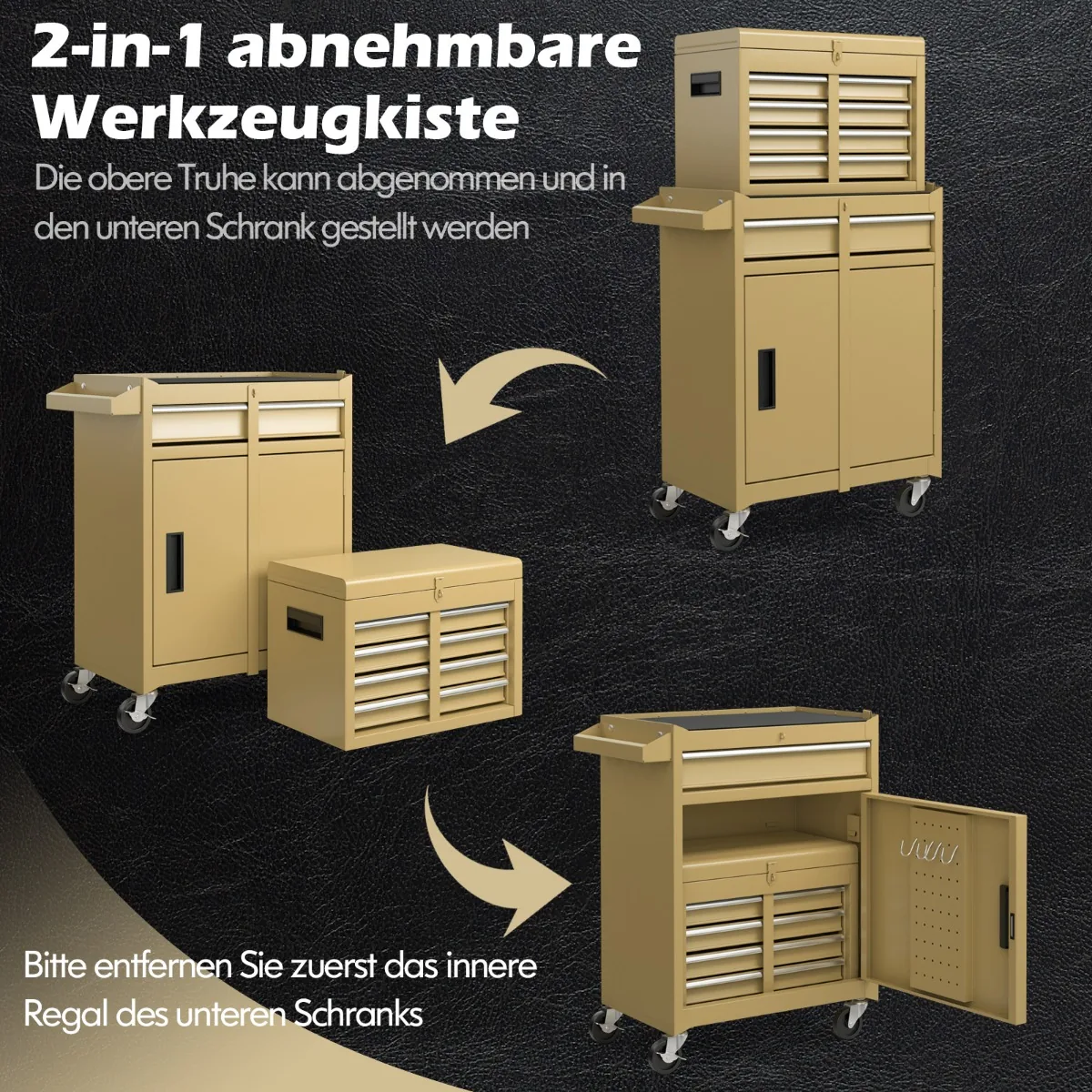 • Nuimama „du viename“ įrankių dėžė, leidžianti pritvirtinti viršutinę dalį apatinėje spintelėje.