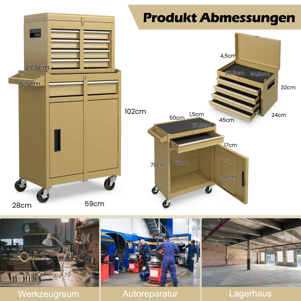 • Įrankių spintelė su užrakinamais ratais užtikrina saugumą ir patogų judėjimą.