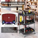 - Trijų lygių įrankių vežimėlis su erdviomis lentynomis ir specializuotais skyrių sprendimais, skirtais butelių, priedų ir įvairių įrankių laikymui.