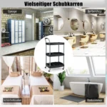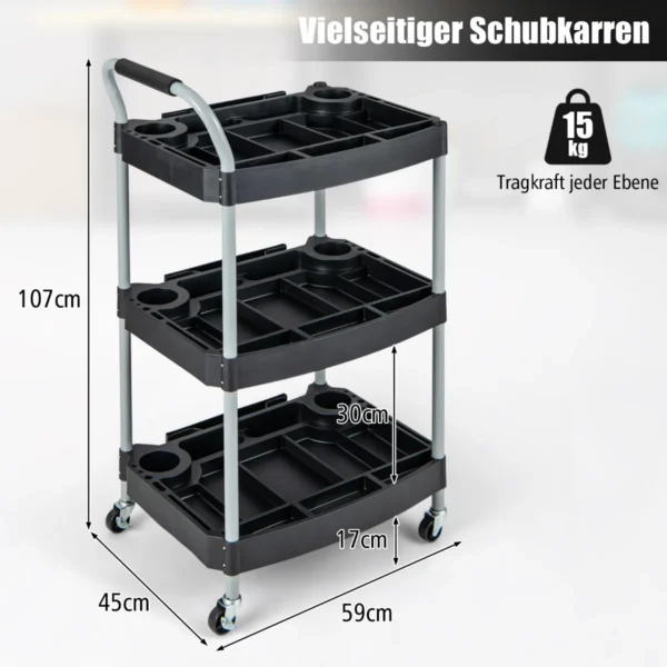 Įrankių vežimėlis 59x45x107cm, juodos spalvos – praktiškas sprendimas įrankių saugojimui ir tvarkymui. Šis trijų pakopų vežimėlis puikiai tinka dirbant garaže, sandėlyje ar serviso patalpose, užtikrinant patogų ir efektyvų darbo vietos organizavimą.