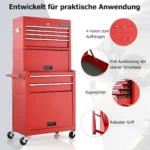 - Įrankių spintelė turi 4 stalčių lygius viršutinėje dalyje ir du erdvius stalčius apatinėje dalyje.
