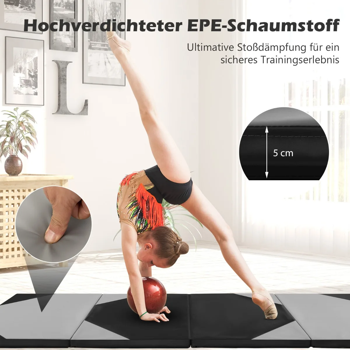 Jogos kilimėlis 300x117x5cm, juodos ir pilkos spalvos, skirtas patogioms ir saugioms treniruotėms namuose ar sporto salėje. Sulankstomas mankštos kilimėlis su storu 5 cm EPE putplasčio paminkštinimu apsaugo sąnarius ir užtikrina smūgių sugėrimą.