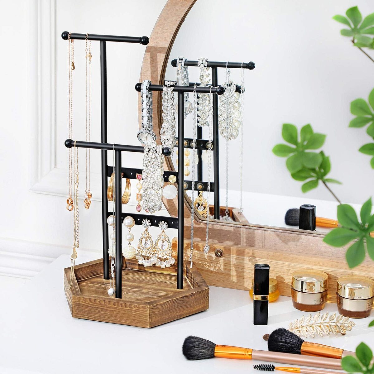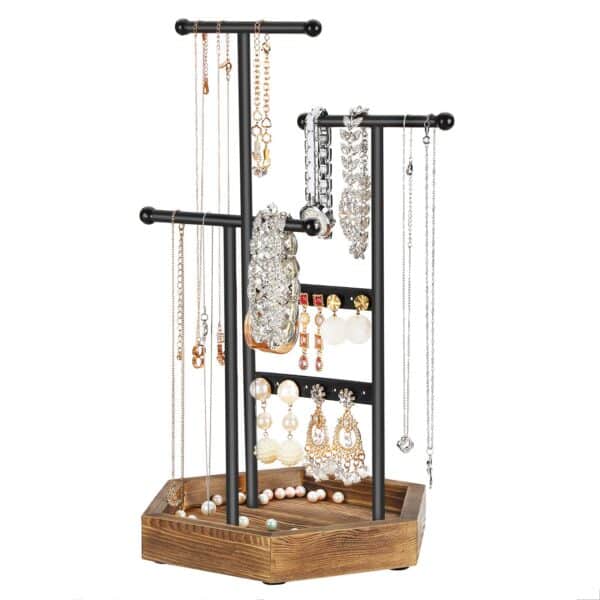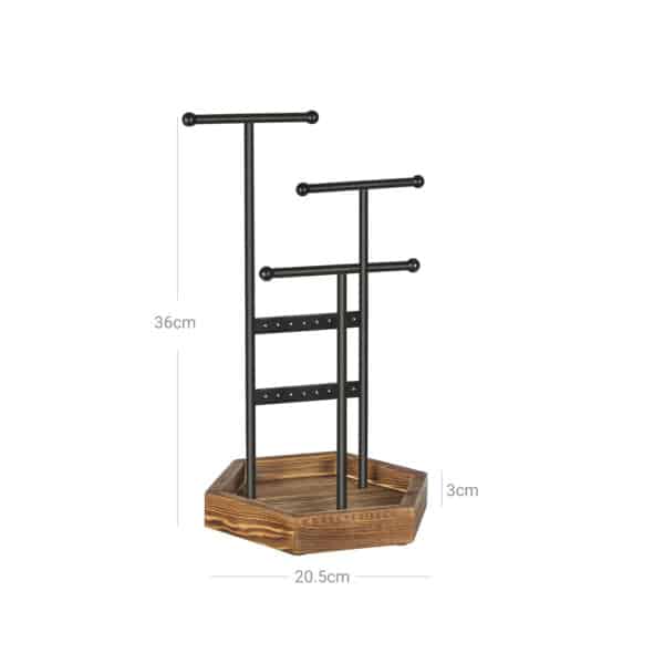 Šis juvelyrinis stovas turi 2 strypelius ir 3 strypelius, kurie suteikia daug vietos jūsų papuošalams. Rutuliniai galai neleidžia papuošalams nuslysti. Juodos ir natūralaus medžio spalvų derinys sukuria estetišką ir elegantišką išvaizdą.