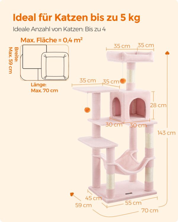 - Dydis: 55 x 45 x 143 cm (Ilgis x Plotis x Aukštis) – pakankamai erdvi, kad patenkintų jūsų kačių poreikius.