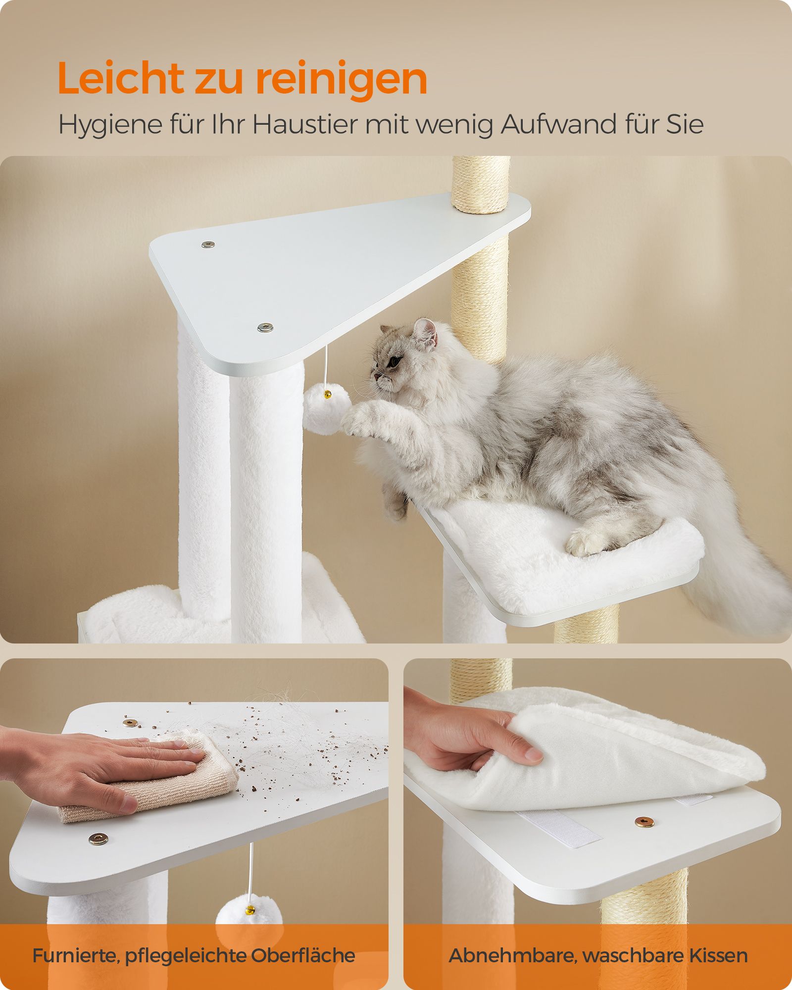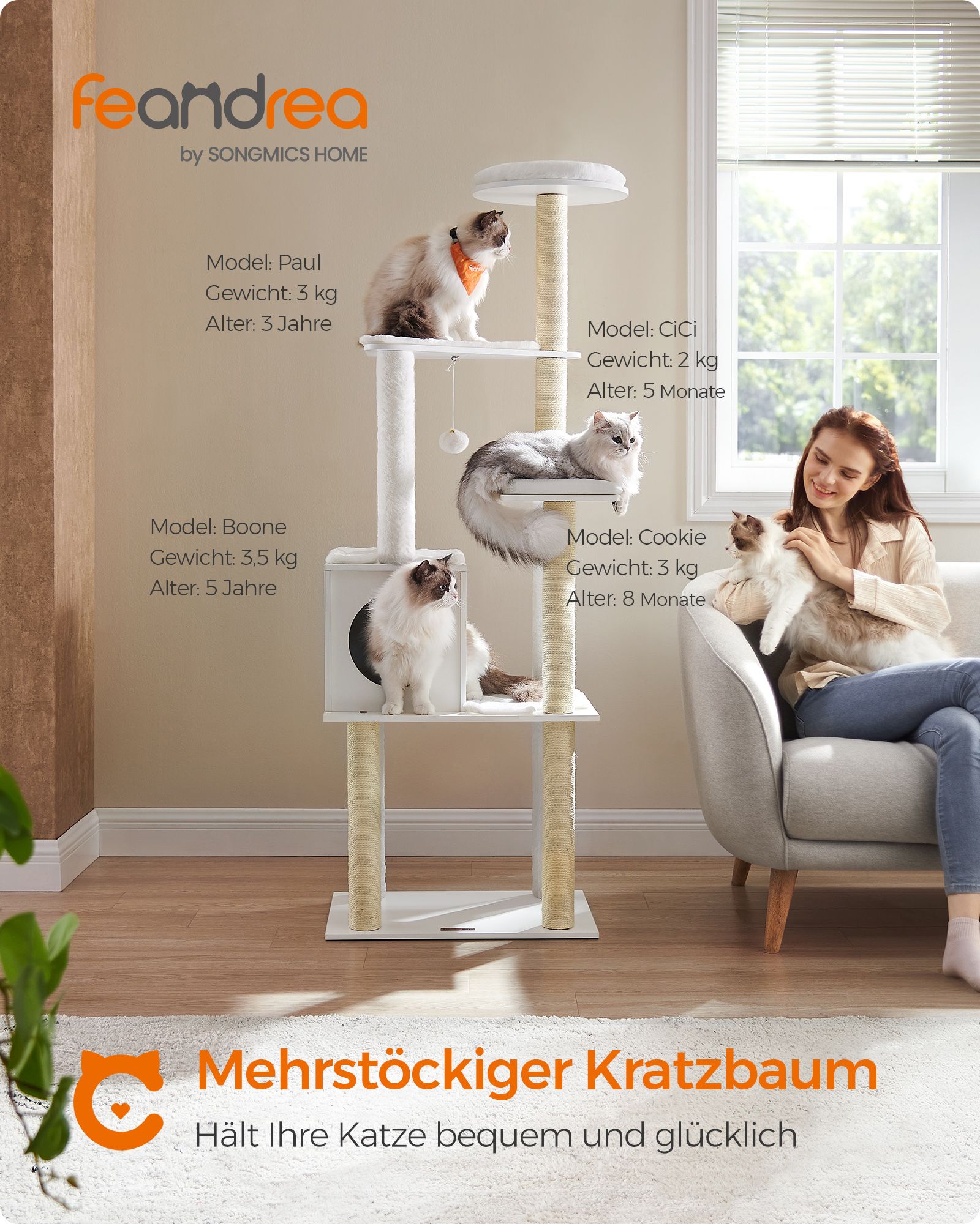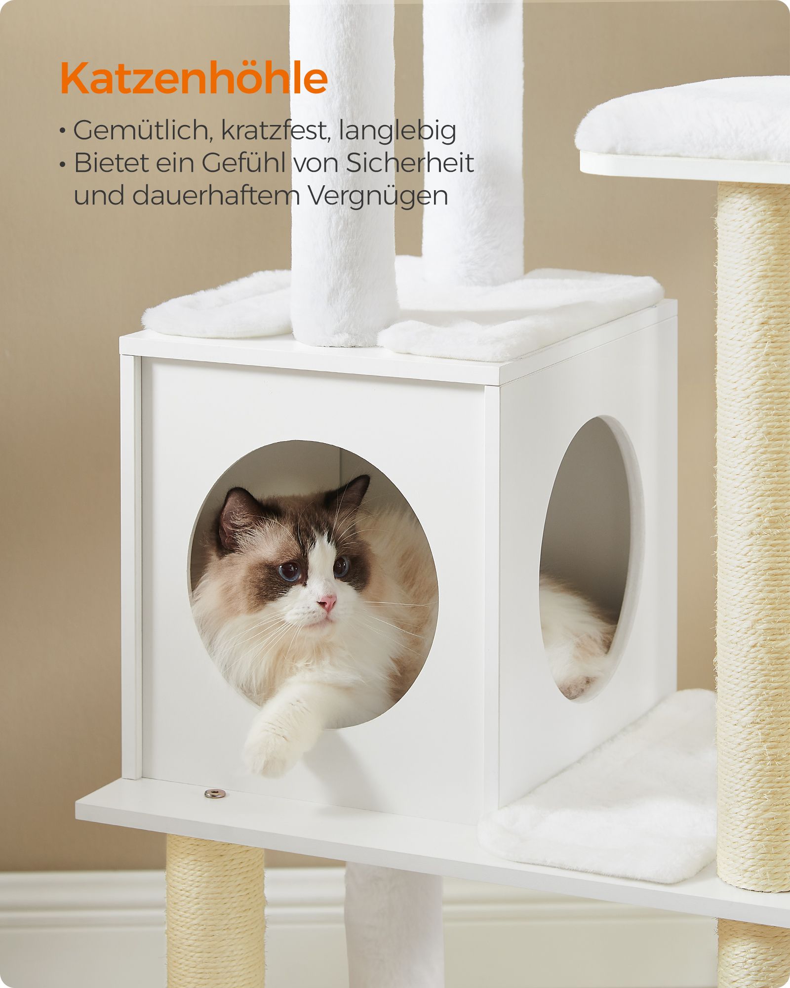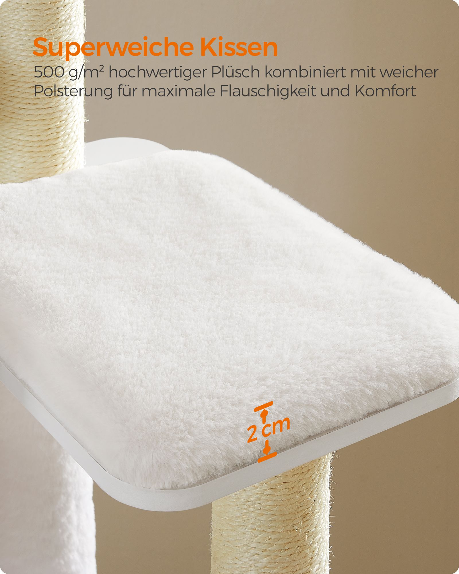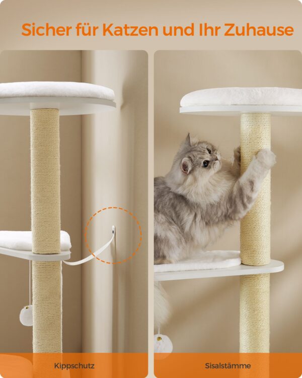 - Medžiaga: Pagaminta iš aukštos kokybės medžio drožlių plokštės, aptraukta 500 g/m² pliušu, kuris yra minkštas ir patogus jūsų katei. Draskymo stulpeliai apvynioti sizaliu, kuris yra natūralus ir patvarus.