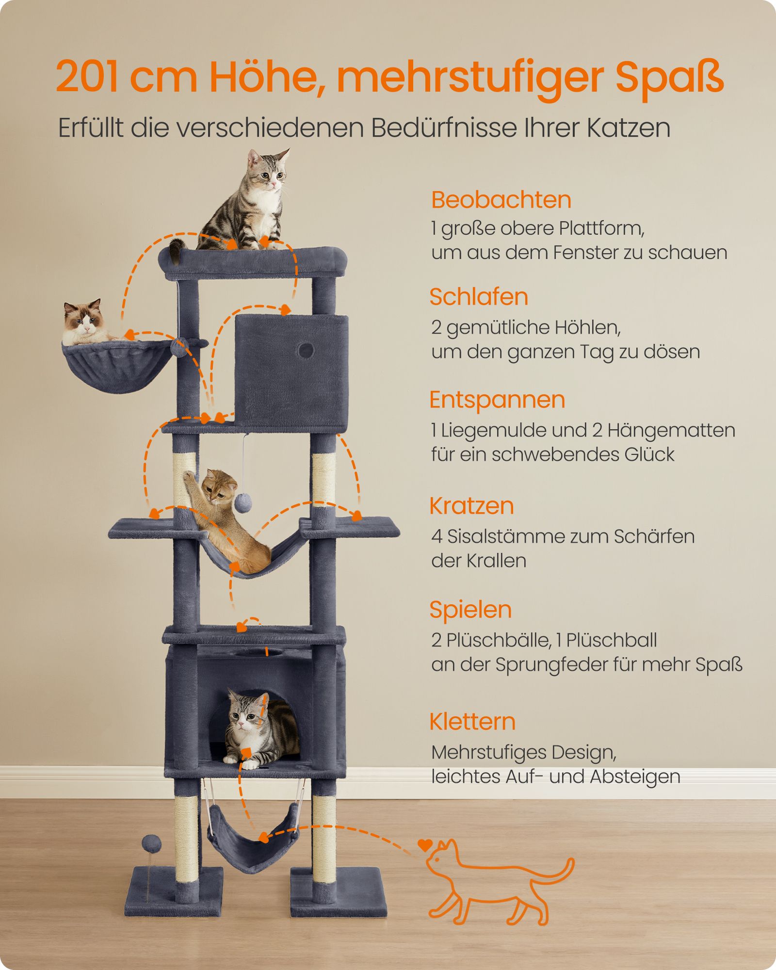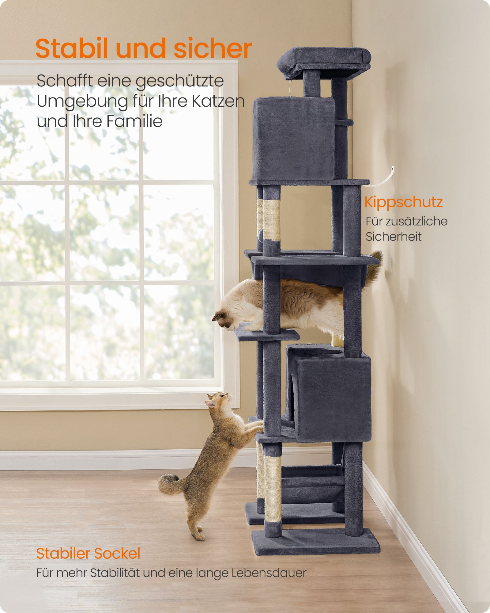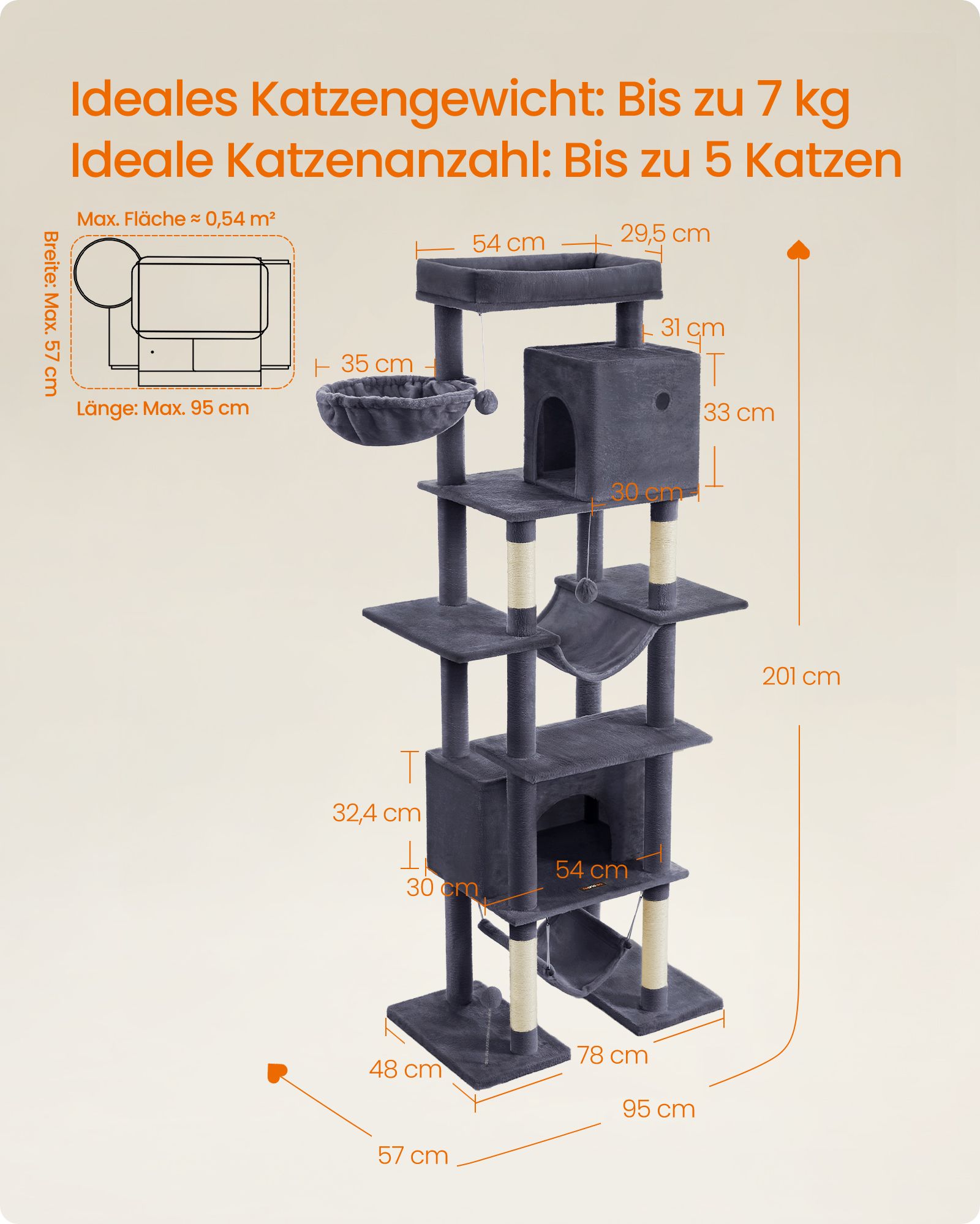 Maksimali bendra statinė apkrova yra 70 kg, todėl ji tinka net ir didesnėms katėms. Ši draskyklė suteiks jūsų katėms daug vietos žaisti ir ilsėtis.