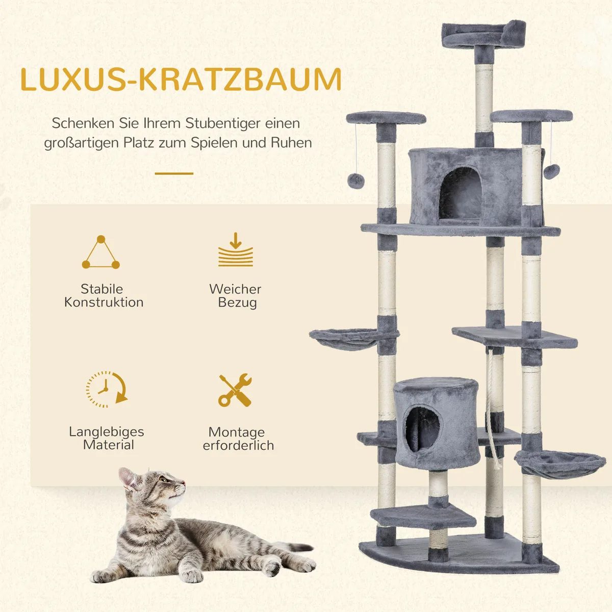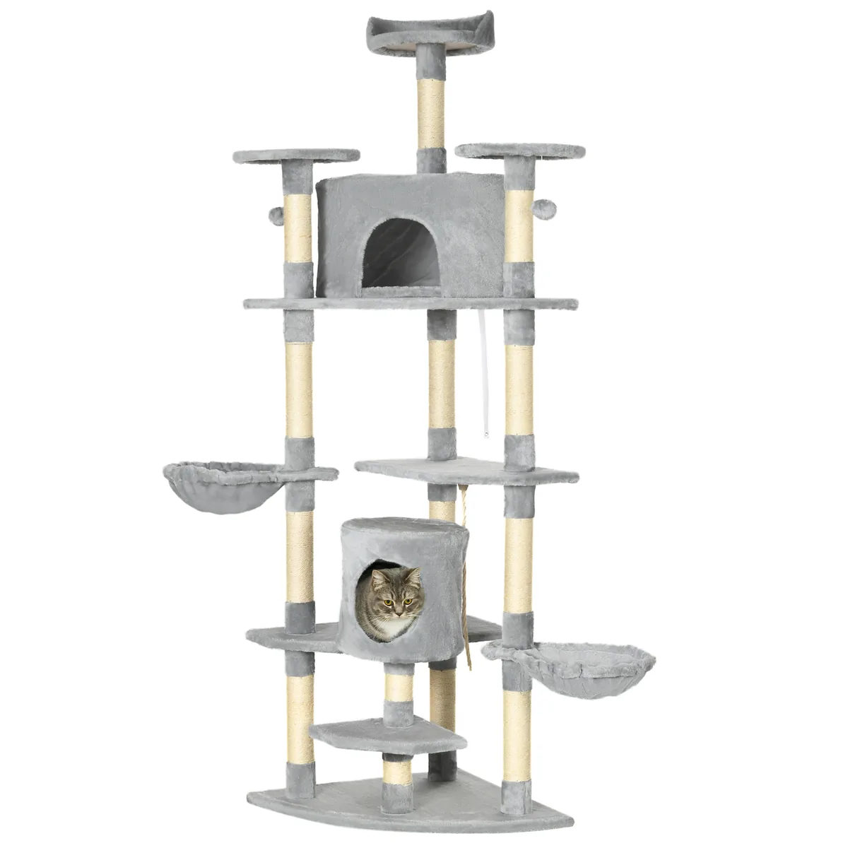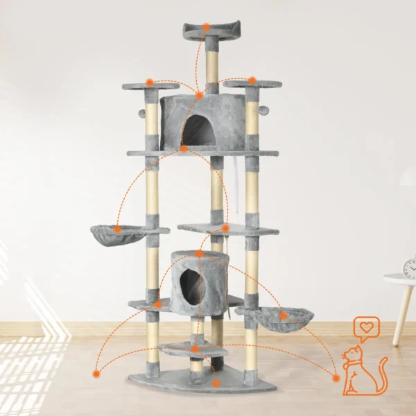 Šis kačių medis iš Pawhut siūlo jūsų katei du kačių urvus, du hamakus, draskymus ir kelias platformas žaisti, snūduriuoti ir miegoti. Kasymo stulpeliai suteikia jūsų katei galimybę pagaląsti nagus, kad jūsų baldai būtų apsaugoti nuo subraižymų. Kačių urvai ir platformos yra išklotos minkštu pliušu ir suteikia jūsų katei jaukią prieglobstį miegoti ir pailsėti.