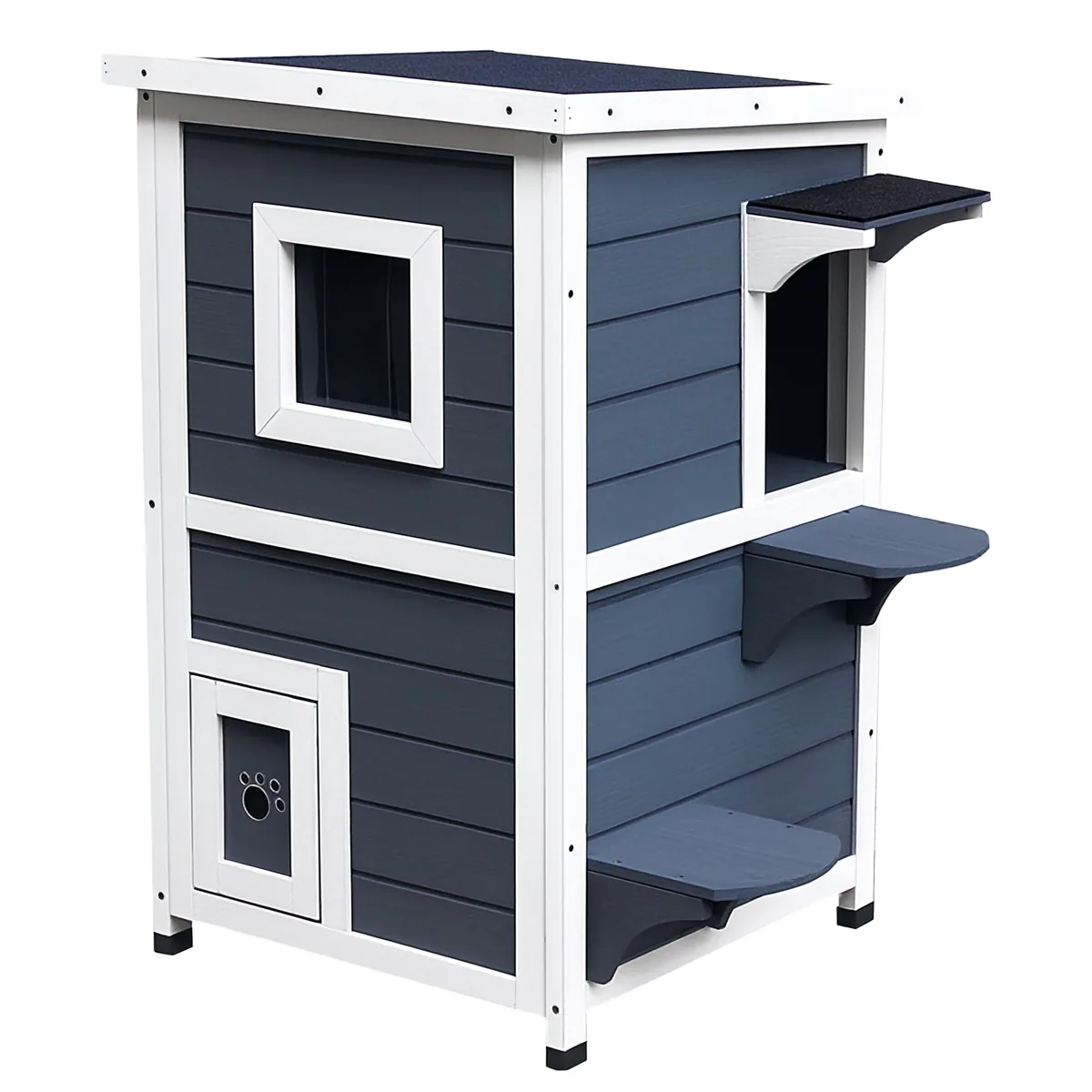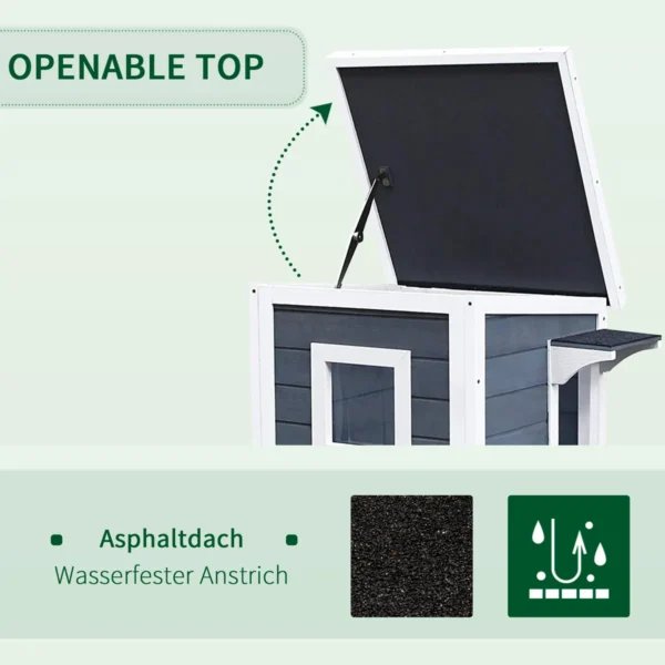 Puikūs namai jūsų beglobiai katei. Mūsų lengvai prižiūrimas kačių namelis, pagamintas iš eglės medienos, ne tik suteikia jūsų mažiesiems draugams apsaugą, bet ir galimybę žaisti bei atsitraukti. Idealiai tinka žaisti. Dėl lengvai atidaromos viršaus ir nuimamo vidurinio skydelio integruotą kraiko dėžę lengva nustatyti ir išvalyti. Dėl asfalto lubų, vandeniui atsparaus dažymo ir pakeltų pėdų kačių namelis idealiai tinka naudoti viduje ir lauke, net ir esant blogam orui.