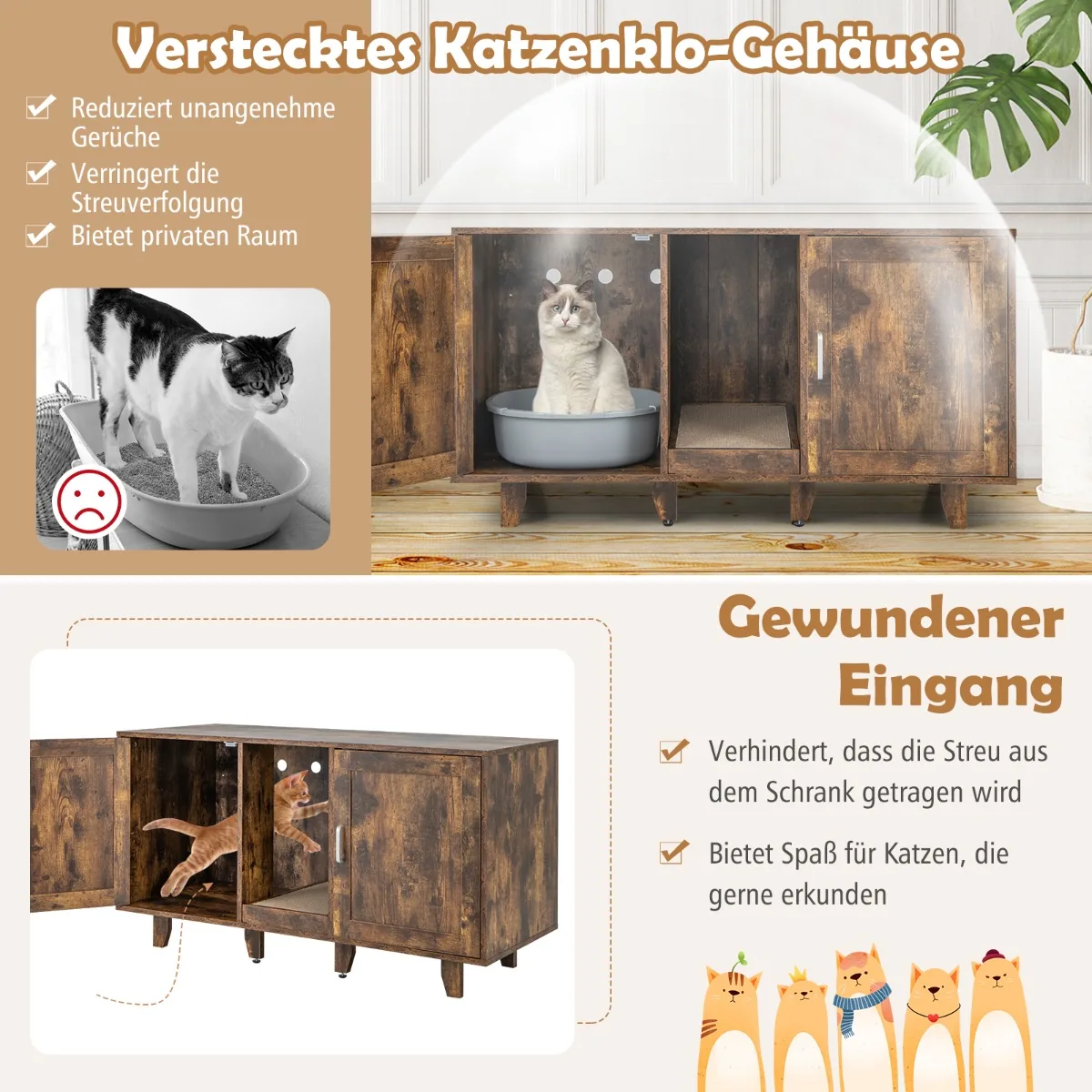 - Paslėpta prieiga į kraiko dėžes, leidžianti katėms jaustis saugiai ir apsauganti nuo kraiko išbarstymo ir kvapų.
