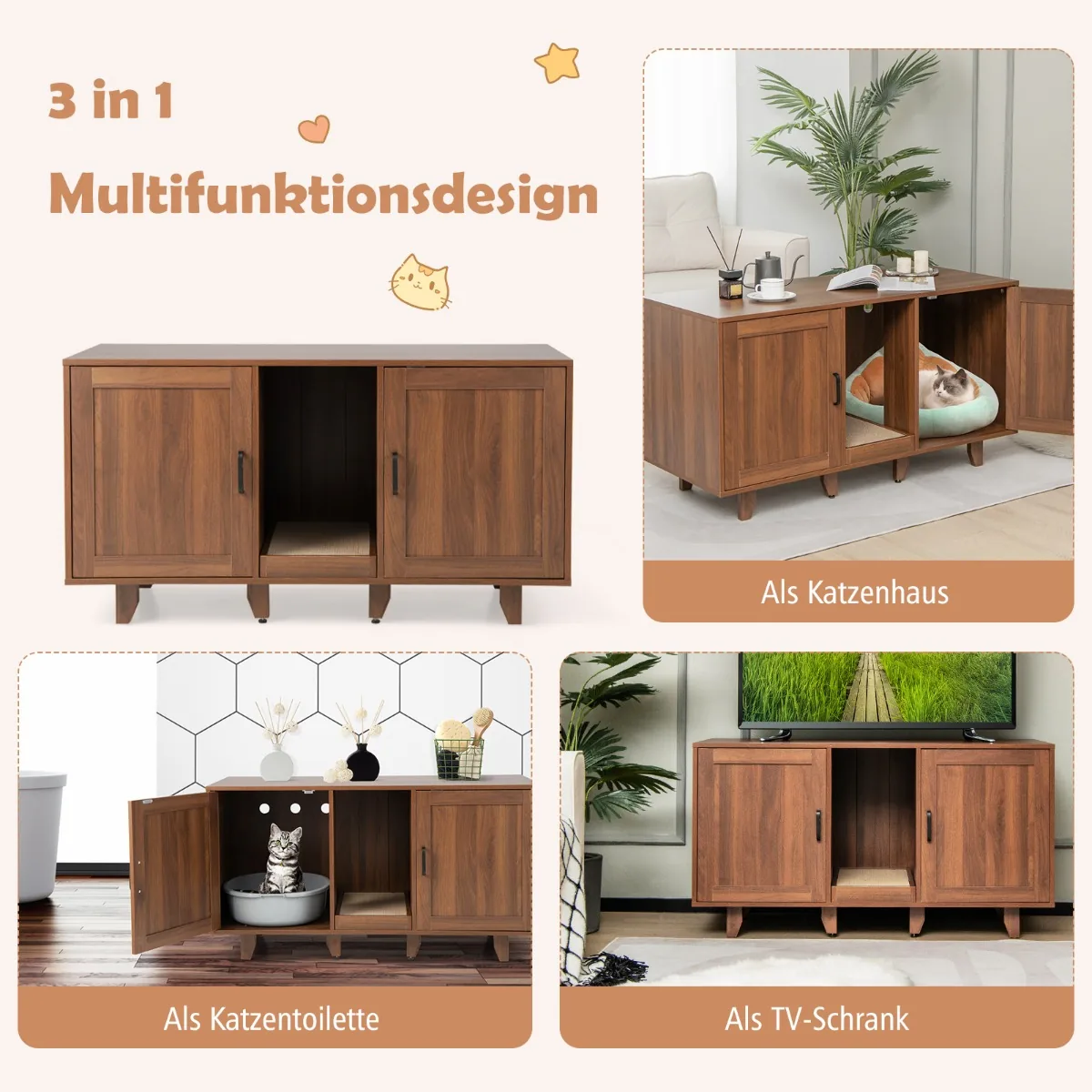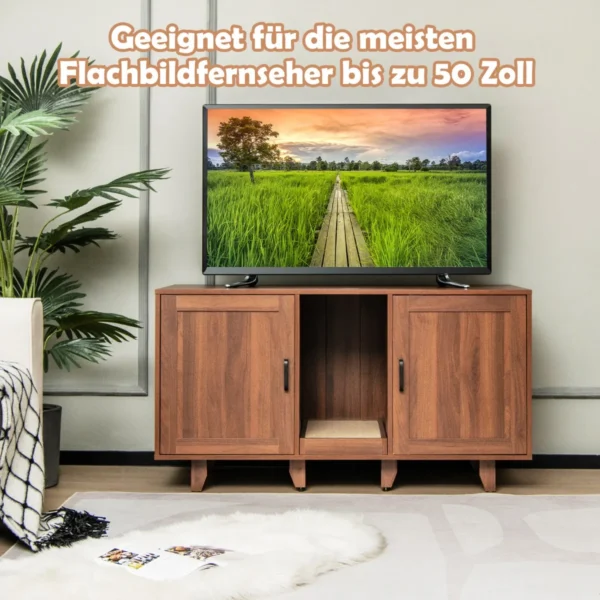 Kačių tualetas 120x52x65cm, rudos spalvos, suteikia praktišką sprendimą jūsų katės higienai ir namų erdvės tvarkai. Šis daugiafunkcis baldas ne tik slėpia kraiko dėžes, bet ir gali būti naudojamas kaip televizoriaus stovas ar šoninis staliukas.