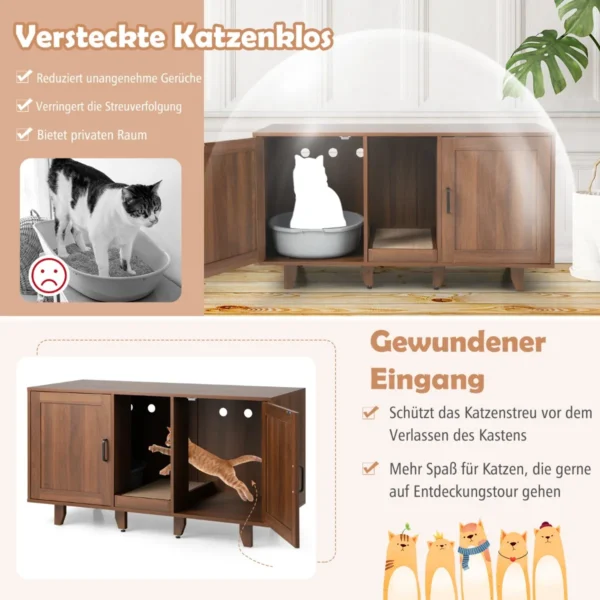 - Paslėptas dviejų skyrių dizainas suteikia katėms privatumo ir sumažina kraiko išsiliejimą bei kvapų plitimą.