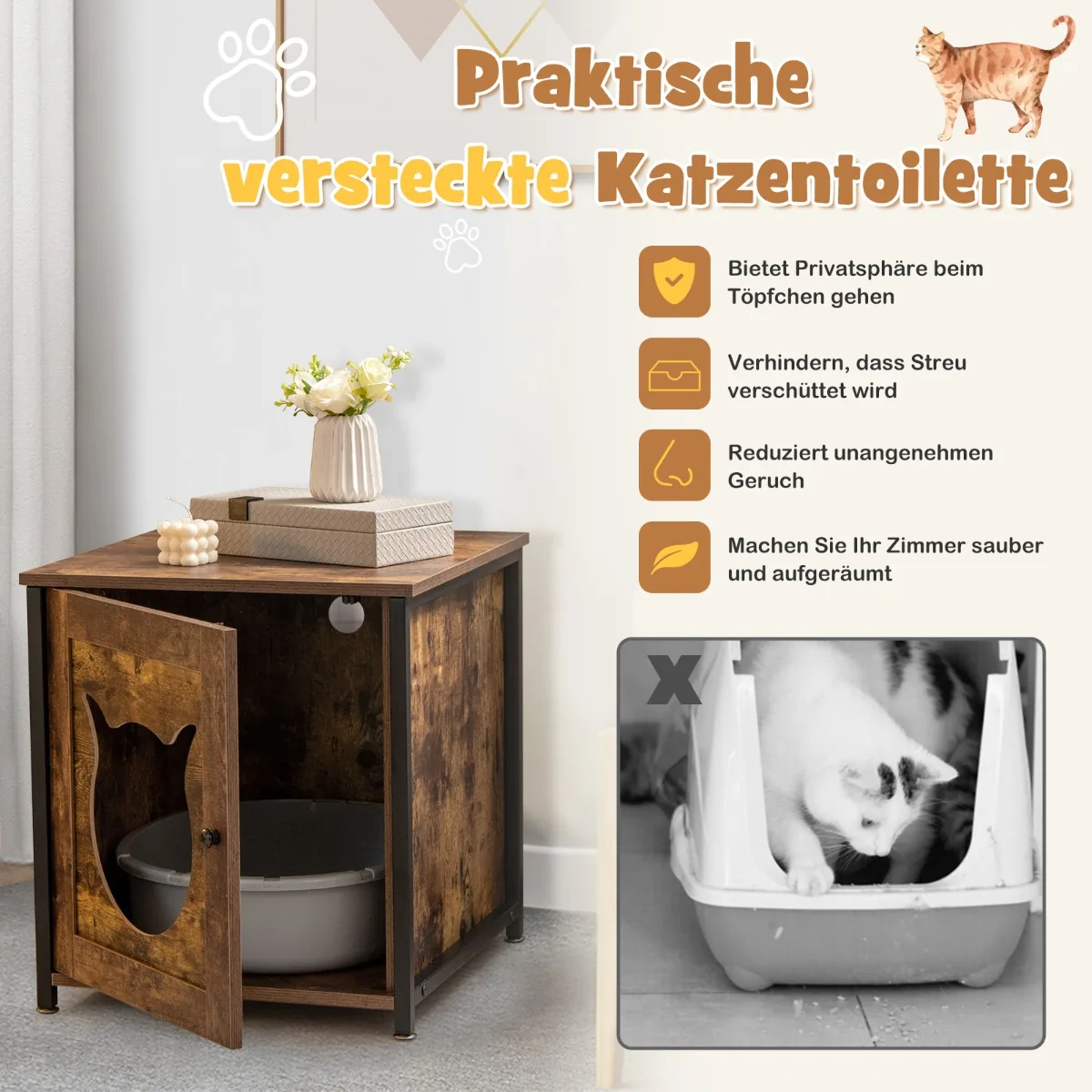 Kačių tualetas 50x53x55cm rudos ir juodos spalvos yra universalus sprendimas jūsų katės privatumui ir patogumui užtikrinti. Šis daugiafunkcis kačių namelis puikiai pritaikytas kraiko dėžėms slėpti, taip pat gali būti naudojamas kaip šoninis staliukas ar vieta kačių reikmenims laikyti.