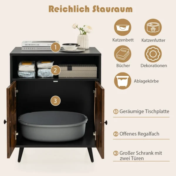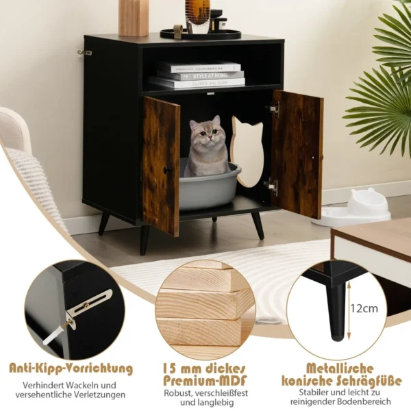 - Dvigubų durų komoda suteikia saugią erdvę kraiko dėžei ir papildomai vietai kačių reikmenims laikyti.