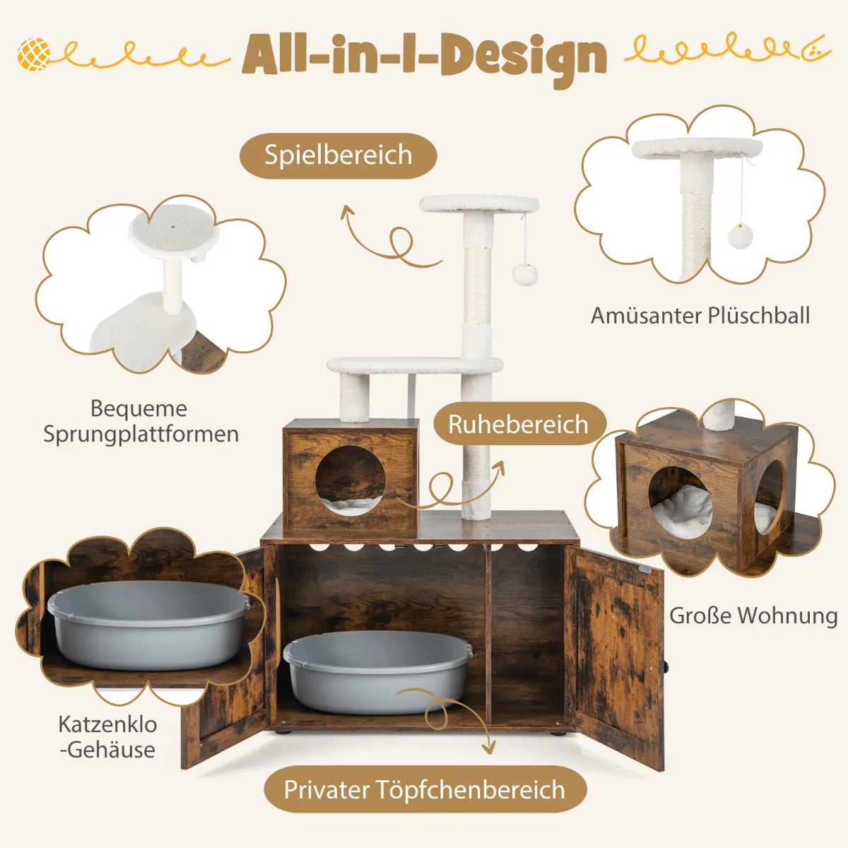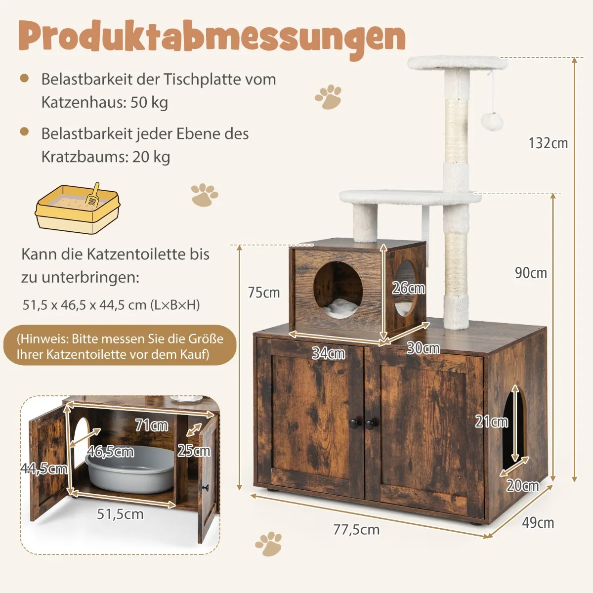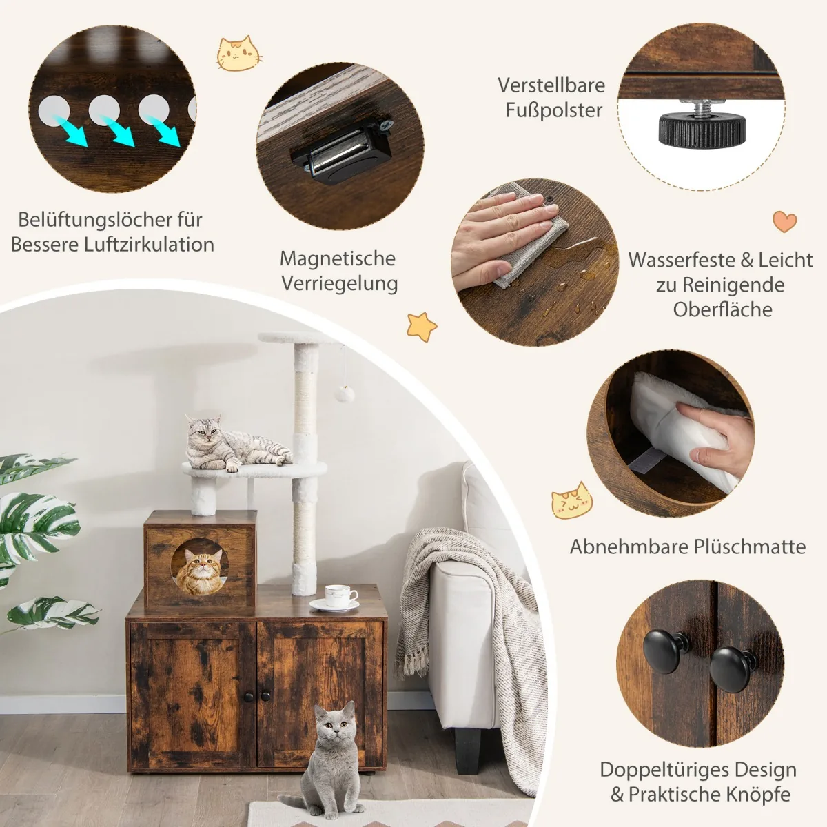 Kačių tualetas 77,5x49x132cm rudos spalvos – funkcionali ir erdvi kačių spintelė, kurios konstrukcija suteikia privatumo, saugumo ir veiklos galimybių Jūsų katei. Šis universalus kačių namelis apjungia kraiko dėžės aptvarą, draskyklę bei poilsio erdves, prisitaikydamas prie natūralių kačių poreikių.