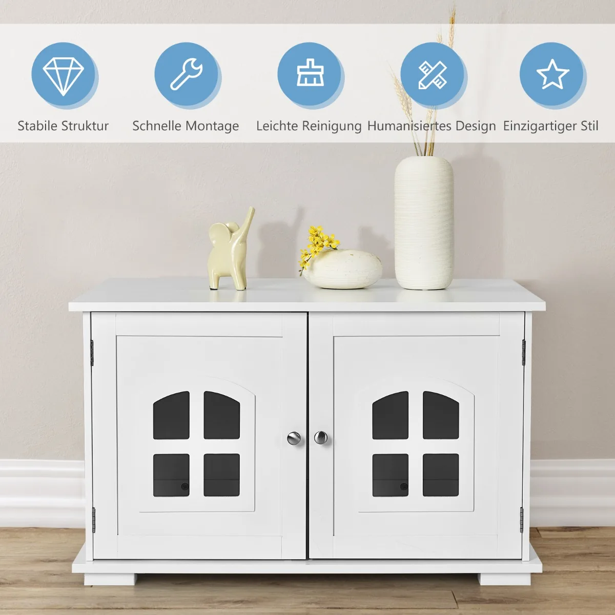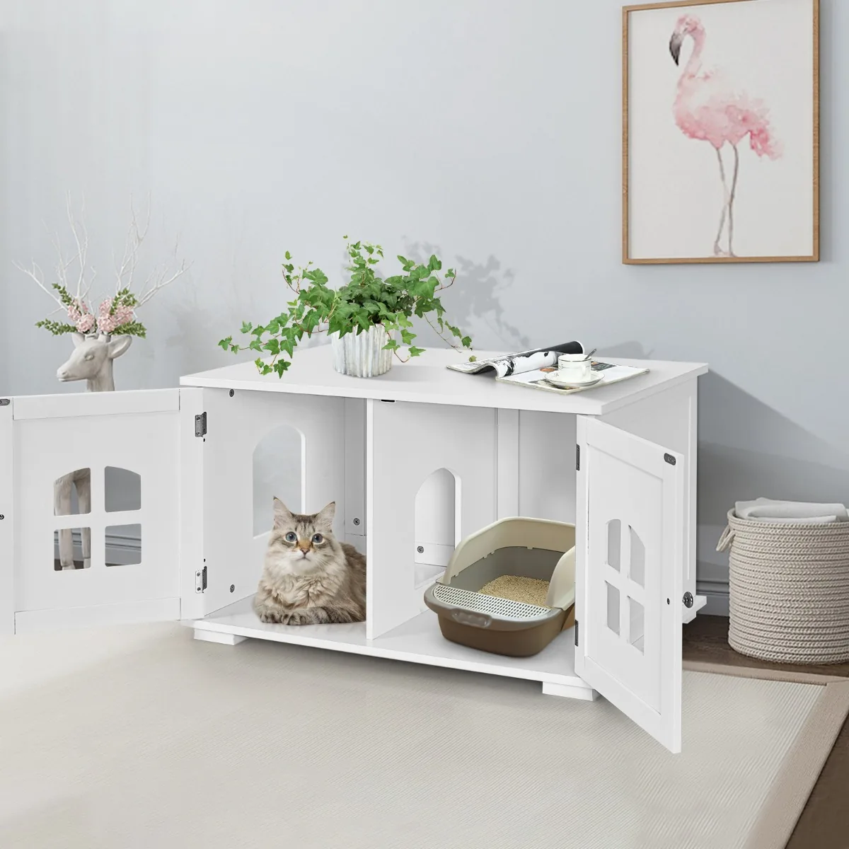 Kačių tualetas 81x53x49cm baltos spalvos yra funkcionalus sprendimas jūsų augintinio poreikiams. Patogus dizainas su dviem įėjimais ir vėdinimo langais užtikrina oro cirkuliaciją ir kvapų sulaikymą. Šis kačių namelis taip pat gali būti naudojamas kaip papildoma namų erdvė arba naktinis staliukas.