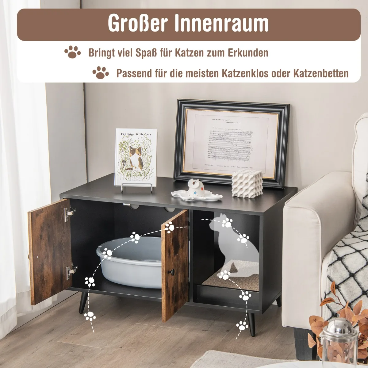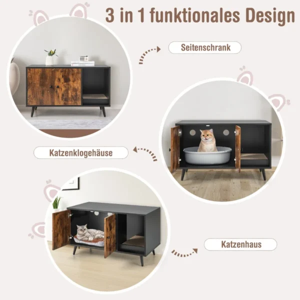- Didelė spintelė su dvigubomis durimis kraiko dėžės slėptuvei arba katės guoliui laikyti.