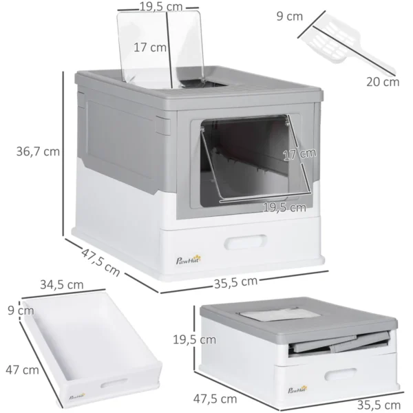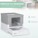 Ši šiuolaikiška kačių kraiko dėžė iš PawHut siūlo jūsų katei saugią ir higienišką vietą savo smulkmenoms užsiimti. Praktiškas dizainas užtikrina tvarką ir švarą bei taupo šiukšles. Barstymo kaušelis su priedu yra įtrauktas į pristatymą. Kačių kraiko dėžutės dizainas yra modernus ir tinka daugeliui skirtingų baldų.