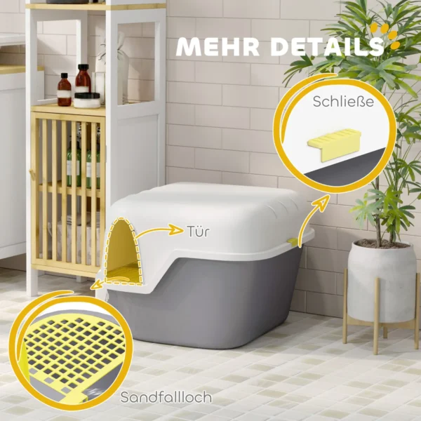 Atraskite stilingą ir praktišką PawHut kačių kraiko dėžutę su dangčiu. Pusiau atvira konstrukcija su smėlio atliekų anga sulaiko nešvarumus ir leidžia jūsų katei patogiai įlipti ir išlipti. Užrakinamas kraiko dangtis gali būti atidaromas valymui ir suteikia erdvioje, dengtoje kraiko dėžėje dar daugiau vietos katėms, sveriančioms iki 3,5 kg. Sumanus dizainas, užtikrinantis komfortą ir švarą!
