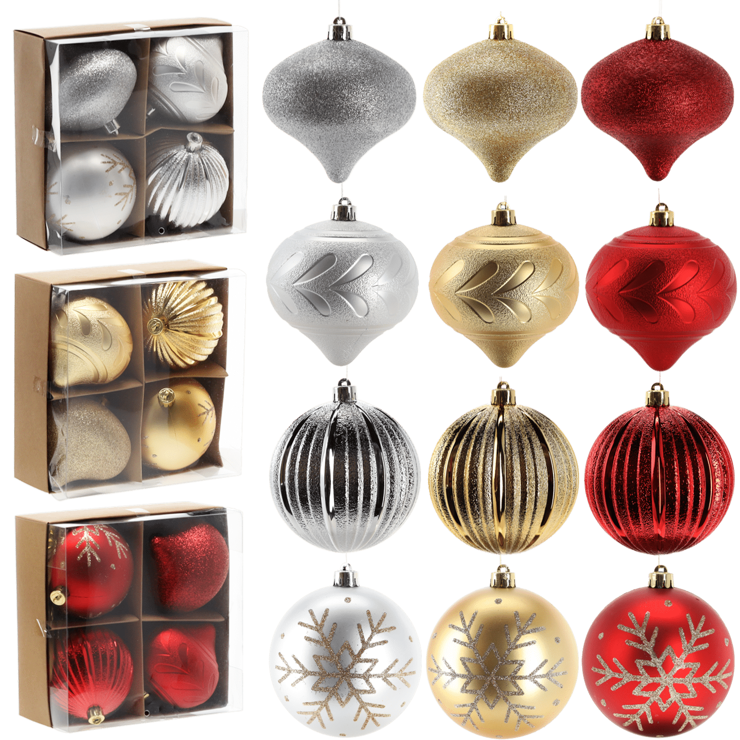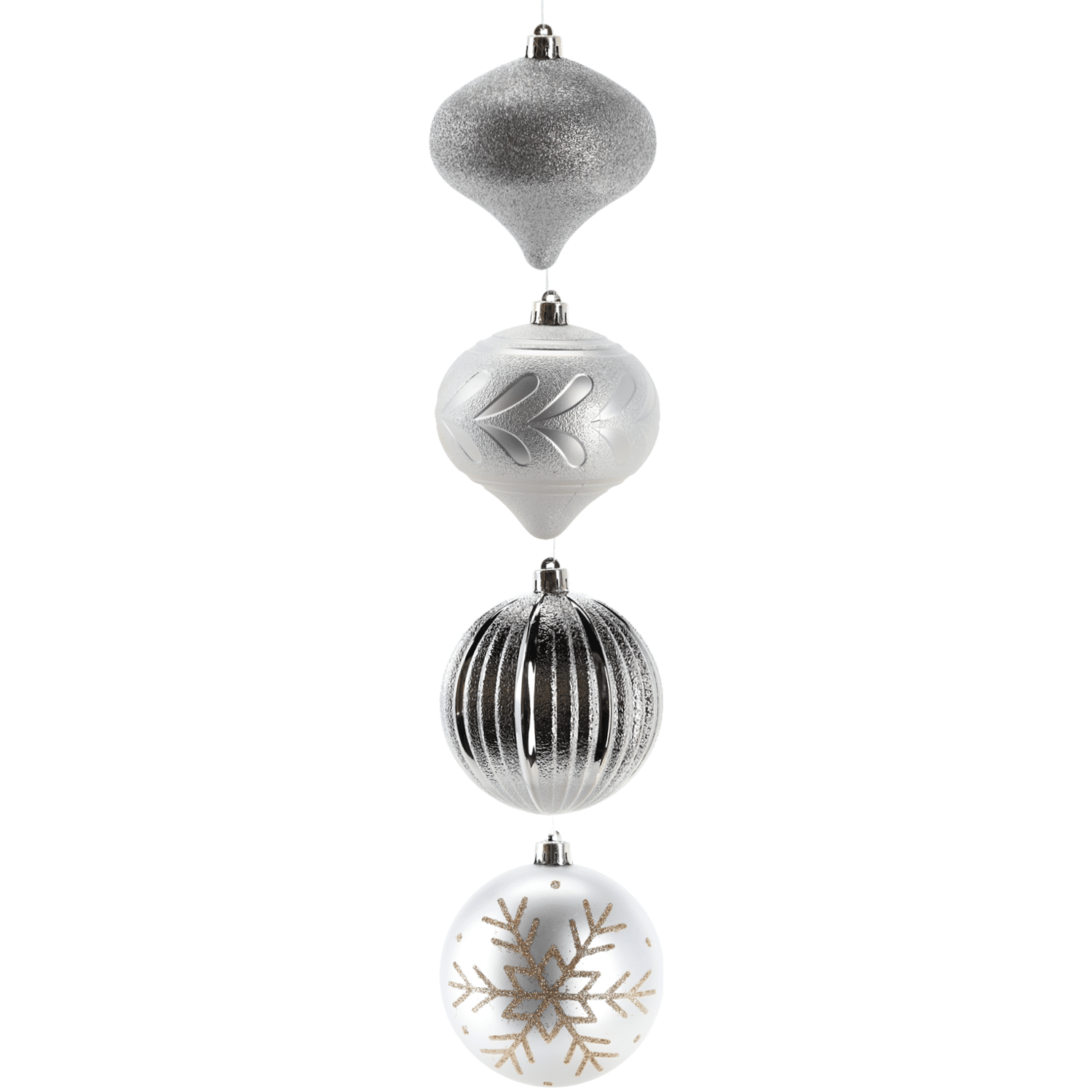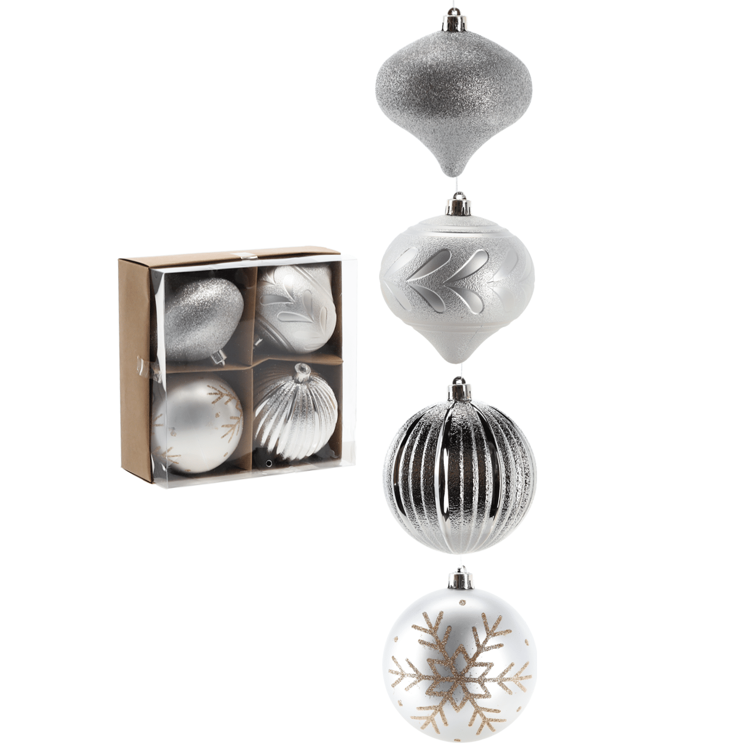 Kalėdos yra laikas, kai viskas turėtų būti stebuklinga! Papuoškite savo eglutę unikaliais papuošalais arba padovanokite kaip unikalią dovaną. Dekoracijos iš aukštos kokybės plastiko. Saugus ir atsparus pažeidimams. Matmenys : 10 cm. Spalva: sidabrinė. 4 dalių rinkinys. Turime ir kitų spalvų bei raštų.