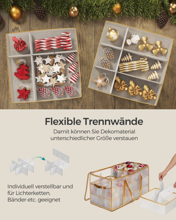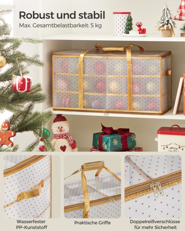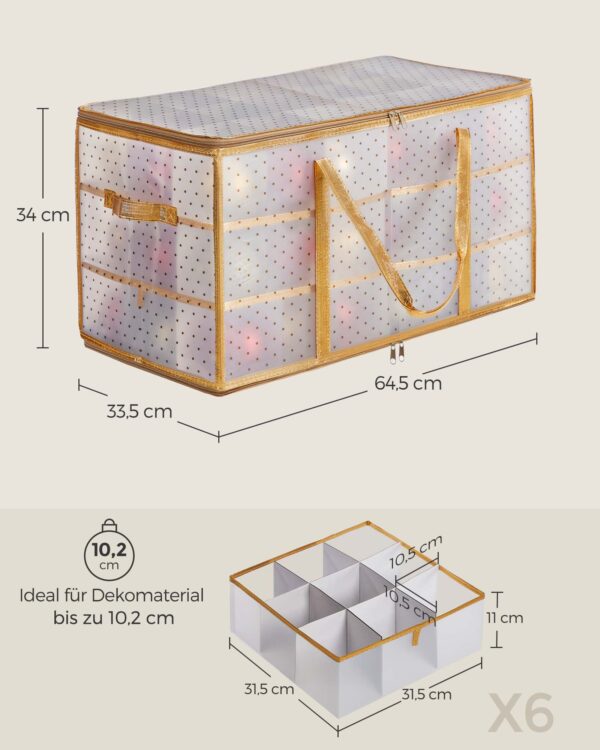 - Dydis: 64,5 x 33,5 x 34 cm (Ilgis x Plotis x Aukštis) – pakankamai erdvi, kad tilptų visi jūsų šventiniai papuošalai.