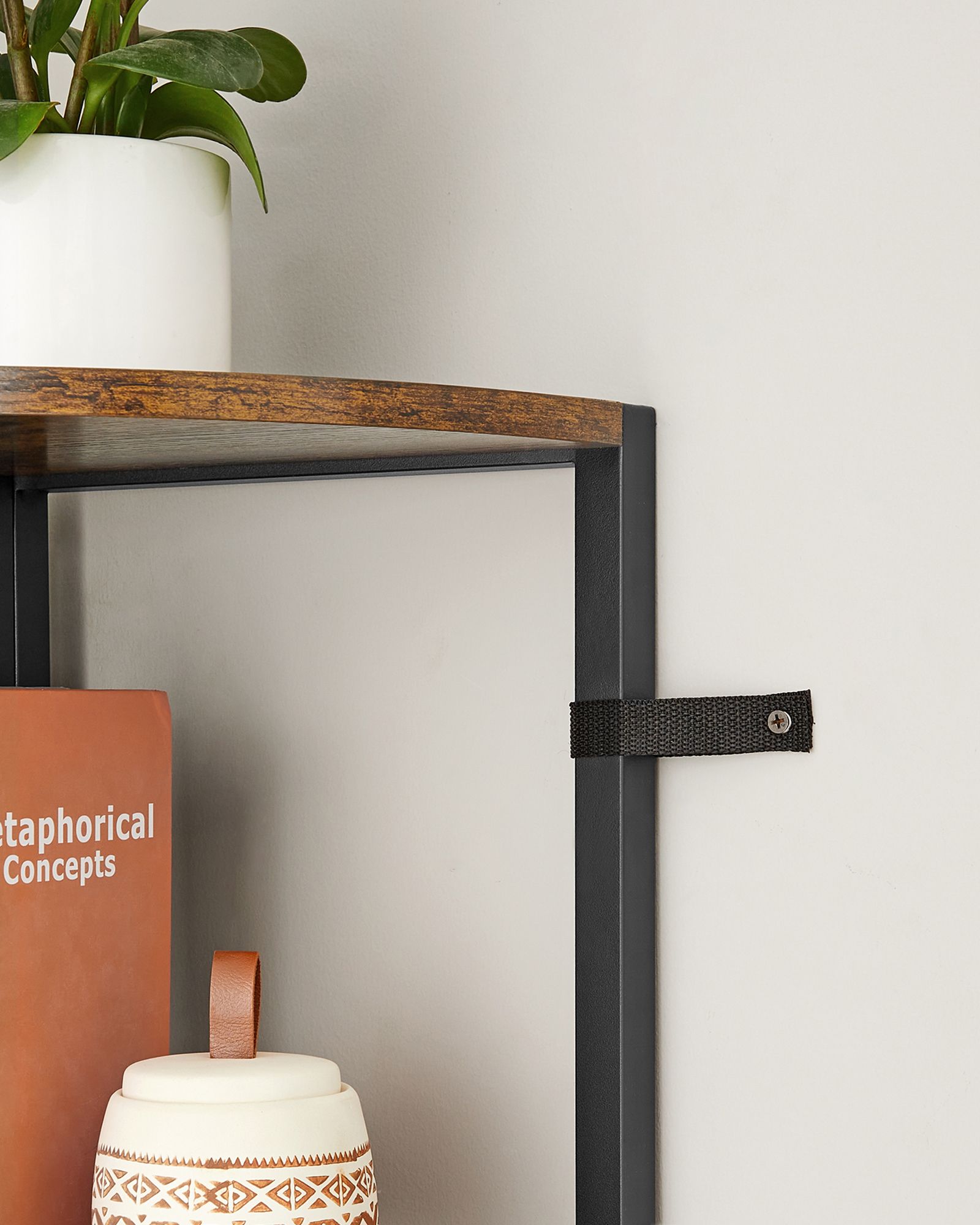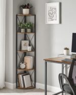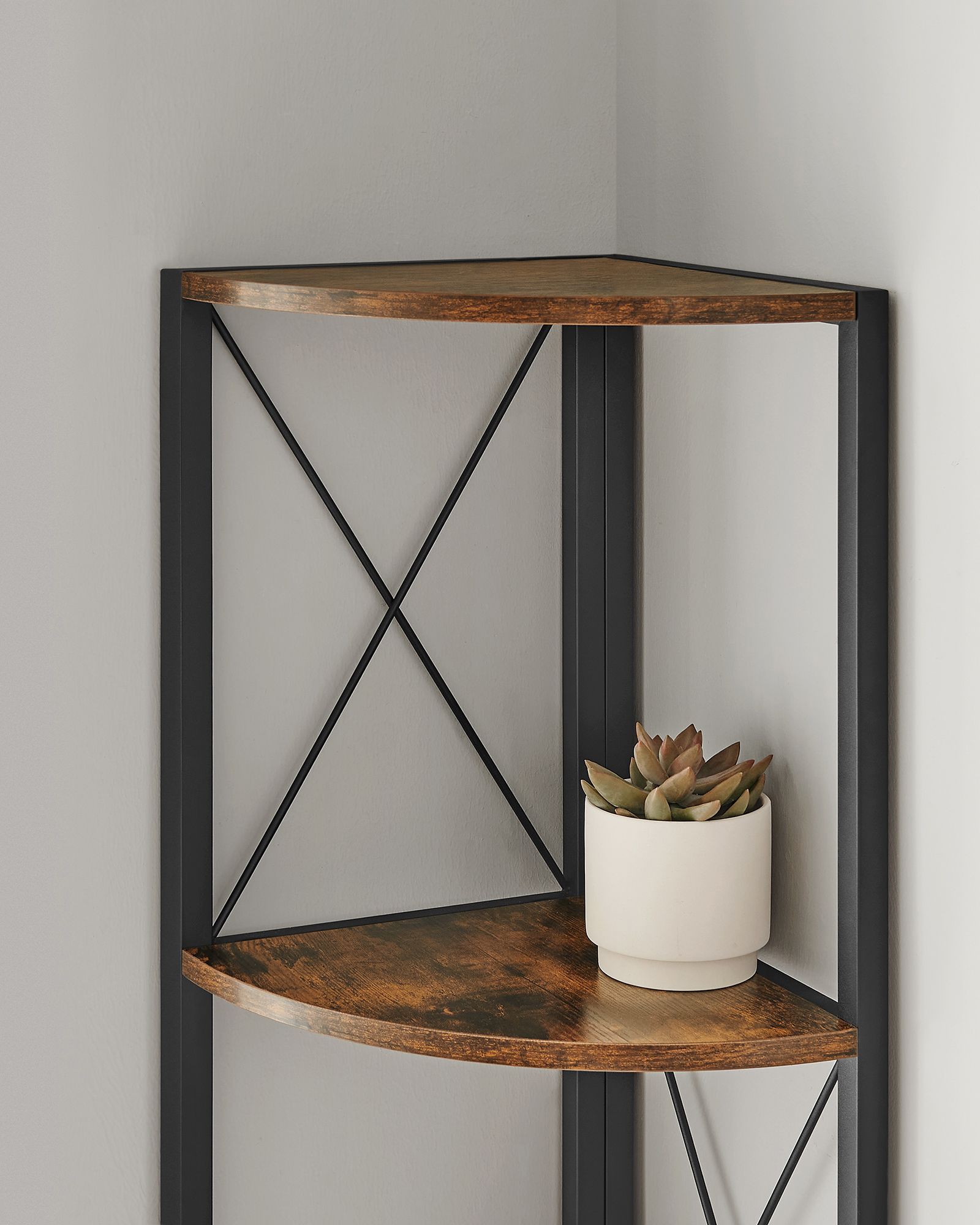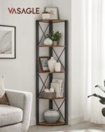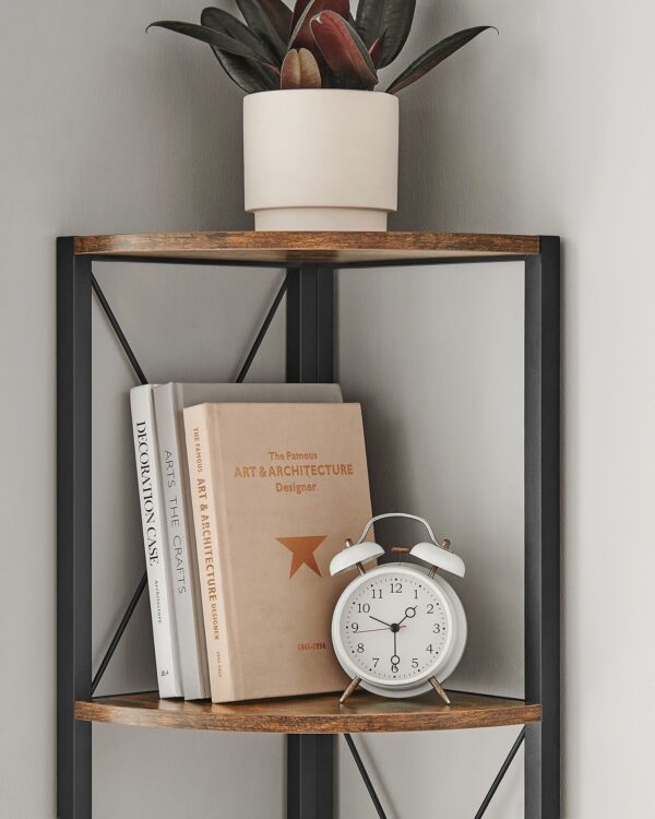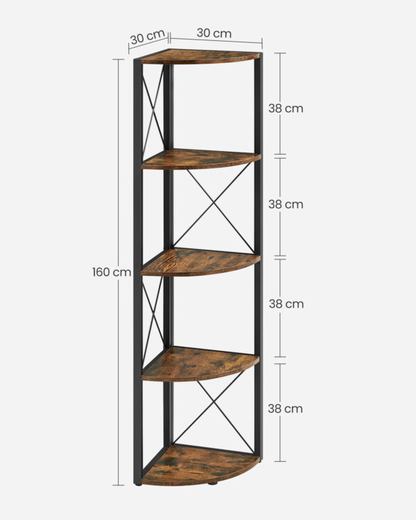 Praturtinkite savo namų interjerą su šia elegantiška ir funkcionalia kampine lentyna. Jos vintažinė ruda ir juoda spalvų derinys suteikia šiuolaikišką ir stilingą išvaizdą, puikiai derančią prie įvairių interjero stilių. Ši lentyna ne tik puikiai atrodo, bet ir yra praktiška, suteikianti papildomos vietos jūsų daiktams laikyti.