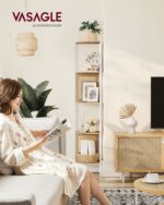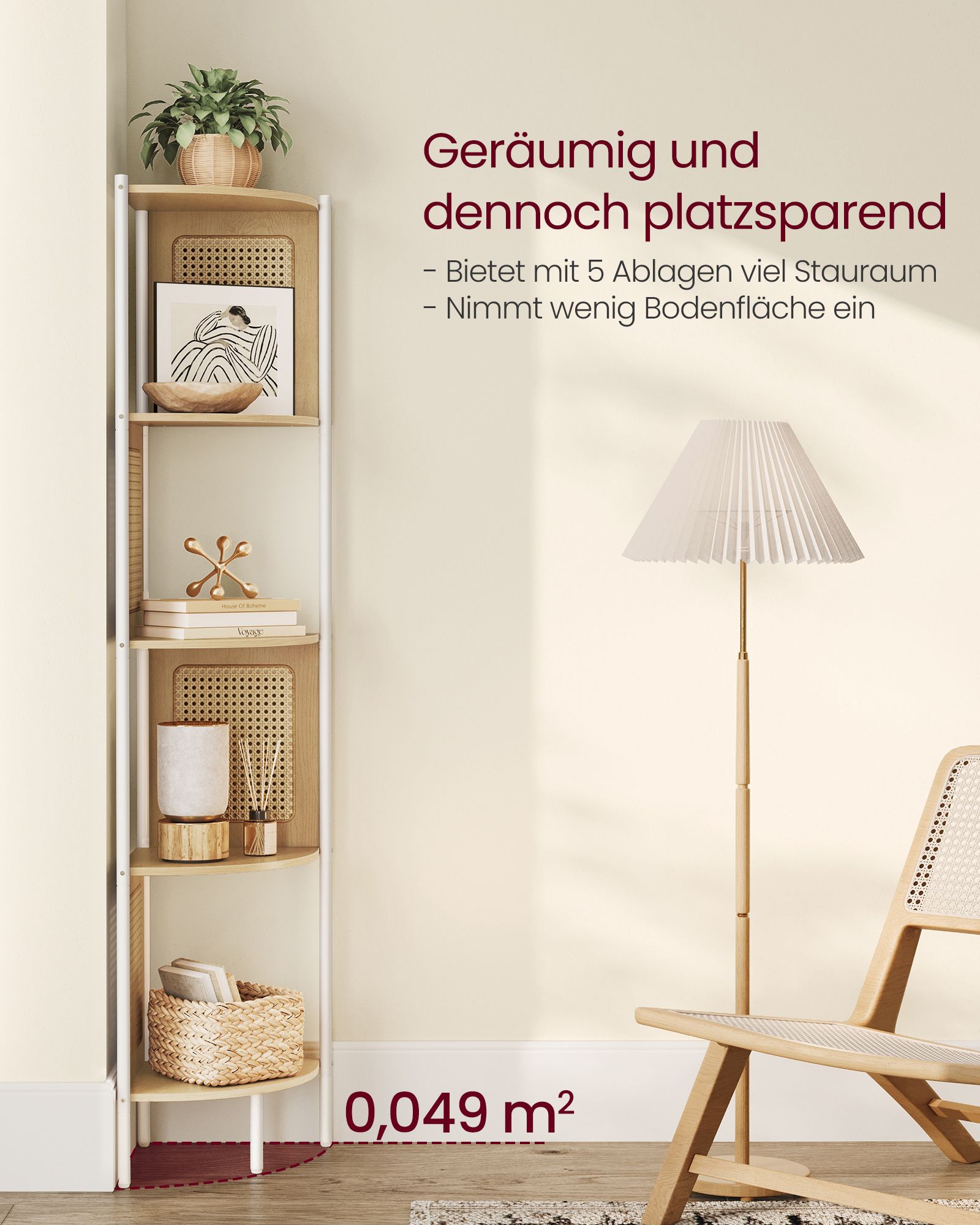 Praturtinkite savo namų interjerą su šia elegantiška ir funkcionalia kampine lentyna. Jos šviesiai rudos ir baltos spalvos derinys suteikia modernumo ir šilumos bet kuriai erdvei, o praktiškas dizainas leidžia efektyviai išnaudoti kampus.