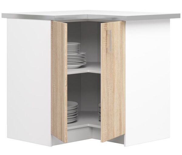 Kampinė virtuvės spintelė S 90/90 N su Lima stalviršiu yra nesenstantis produktas iš reklaminio rinkinio. Sonoma ąžuolo priekinė apdaila su natūralaus medžio struktūra suteikia baldui įdomios išvaizdos, o tai, kad jis pagamintas iš trinčiai atsparios laminuotos plokštės – ilgaamžiškumo garantas. Spintelės viduje yra viena, bet labai erdvi lentyna, kurioje lengvai telpa daug indų, maisto ir valymo priemonių. Baldai gali būti laisvai derinami su kita mūsų pasiūlyme esančia virtuvės įranga. Siūlome aukštos kokybės gaminius, kurių stipriosios pusės – ne tik universali išvaizda ir funkcionalumas, bet ir konkurencinga kaina. Kampinė spintelė puikiai tiks tiek didelėms, tiek mažoms virtuvėms. Korpuso spalva – Balta Priekinė spalva – Sonoma ąžuolas – Spintelė iš laminuotos plokštės, abrazyvinė atsparus – Durelių viduje yra viena lentyna. – Baltas stalviršis su sidabro apvadu NEMOKAMAI!!!