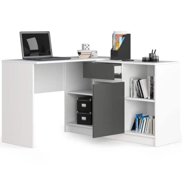 Baltos spalvos kampinis stalas B-15 su grafito pilkais fasadais yra labai praktiškas baldų tipas, kuris dėl panaudotų sprendimų apjungia rašomojo stalo ir komodos funkcijas. Toks derinys leido įgyti nemažai papildomos erdvės, kurią galime išplėtoti priklausomai nuo individualių poreikių. Todėl gaminys puikiai tiks ne tik mūsų vaiko kambaryje, taip tarnaudamas kaip mokymosi ir namų darbų mokymosi priemonė, bet ir kaip namų biuro įrangos elementas. Puikiai tiks ir kaip biuro baldas, juolab kad jo gamybai buvo panaudota tvirta laminuota plokštė. Didelis pristatomo stalo modelio funkcionalumas nėra vienintelis jo privalumas / privalumas naudoti. Tiesą sakant, produktas siūlo daugybę kitų privalumų, nes: yra daug vietos saugykloje, lentynos sėkmingai tilps, be kita ko segtuvai, pasižymi universalumu rinkinio tvirtinimo požiūriu, t. y. derinys dešinėje arba kairėje pusėje. Kampinis stalas B-15 – tai gaminys, kuriame estetinę apdailą užtikrino ABS apvadas, kuriuo buvo uždengtas baldo kraštas. Ši problema taip pat turi didelę įtaką stalo atsparumui pažeidimams. Be to, dėl panaudotų metalinių ritinėlių kreiptuvų buvo užtikrintas patogus ir efektyvus stalčių atidarymas ir uždarymas.