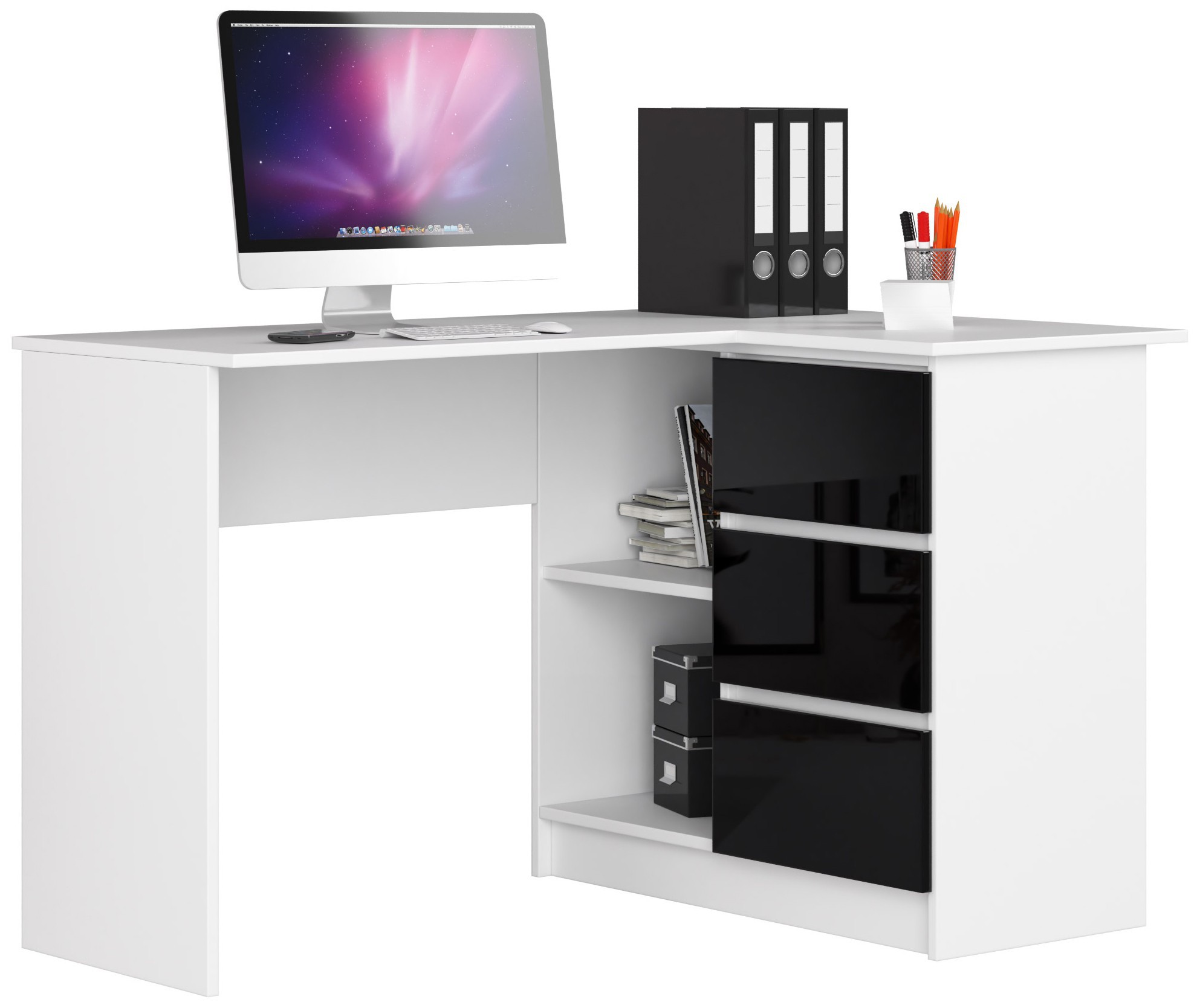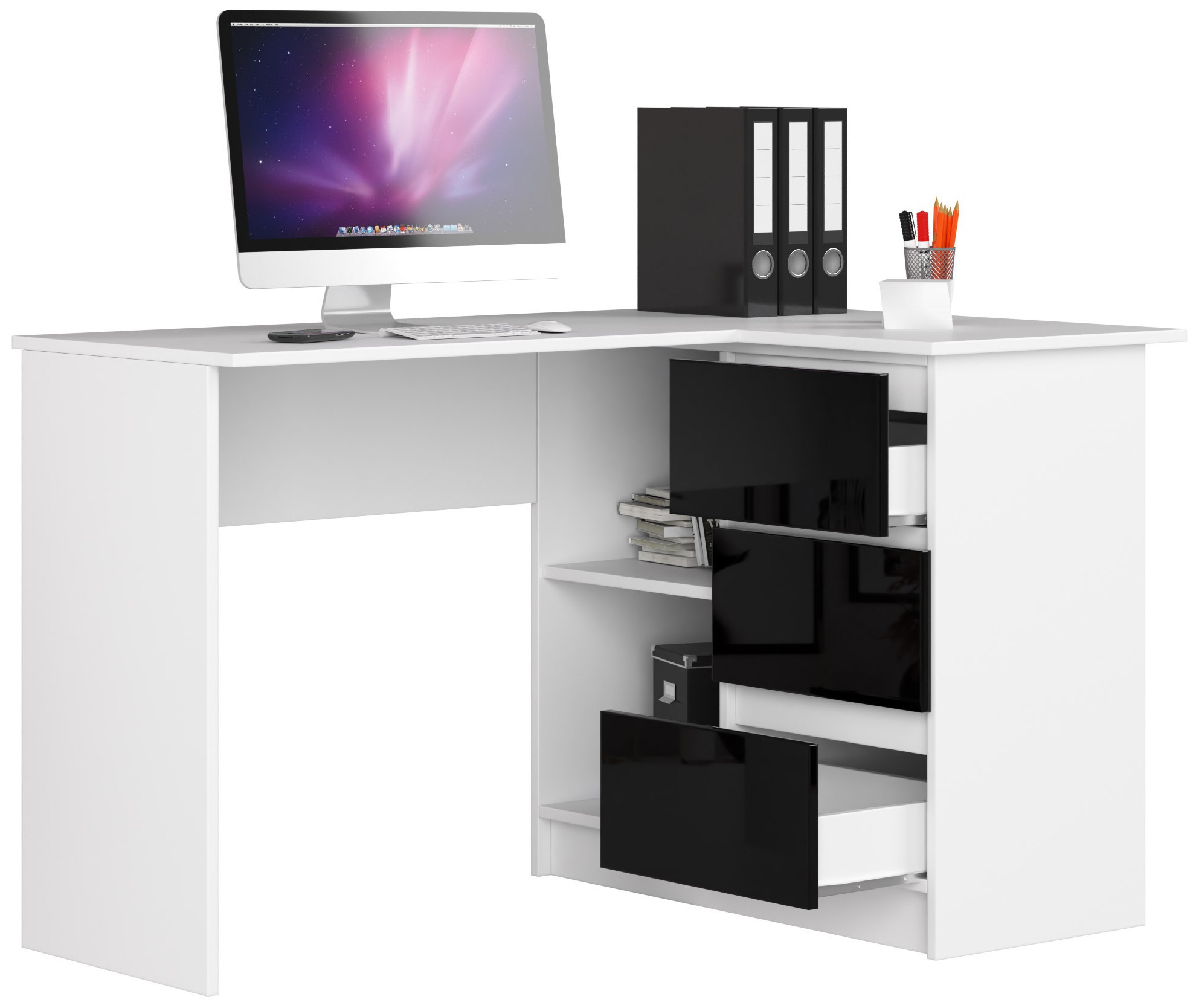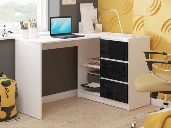 Žaidžiams, studentams, ieškantiems vietos mokytis ir suaugusiems, dirbantiems nuotoliniu būdu, rekomenduojamas patogus kompiuterio stalas su trimis stalčiais. Baldo konstrukcija pagaminta iš 16mm storio laminuotos plokštės, kuri yra labai atspari trinčiai. Durų fasadai paruošti akrilo technologija, todėl jos turi aukščiausią blizgesį tarp panašių baldų. Dėl pritaikyto dydžio rašomasis stalas turi didelę talpą papildomiems priedams susidėti. Stalčių sistemos sumontuotos ant metalinių ritinėlių kreiptuvų, kurie eksploatacijos metu neužstringa. Be to, stalo kraštai buvo pritvirtinti ABS briauna, kuri padidina jų tvirtumą ir atsparumą mechaniniams pažeidimams. Gamintojas pateikia baldus kliento savarankiškai surenkamu variantu, be užsakytų prekių pateikiamos aiškios surinkimo instrukcijos. Užsakyto kampinio stalo garantinis laikotarpis yra 24 mėnesiai nuo įsigijimo. – Rašomasis stalas iš Kronospan laminuotos plokštės, 16 mm atsparus trinčiai – Fasadai pagaminti naudojant akrilo technologiją – Aukščiausias blizgesio standartas rinkoje – Turi daug vietos bet kokiam išdėstymui – Segtuvai lengvai tilps lentynose – Stalčiai juda ant metalinių ritinėlių kreiptuvų – Matoma kraštai padengti ABS briauna, kad būtų didesnis atsparumas pažeidimams – Savarankiško surinkimo stalas – Kampinis kompiuterio stalas – Pristatomas vadovas – Garantija 24 mėn.