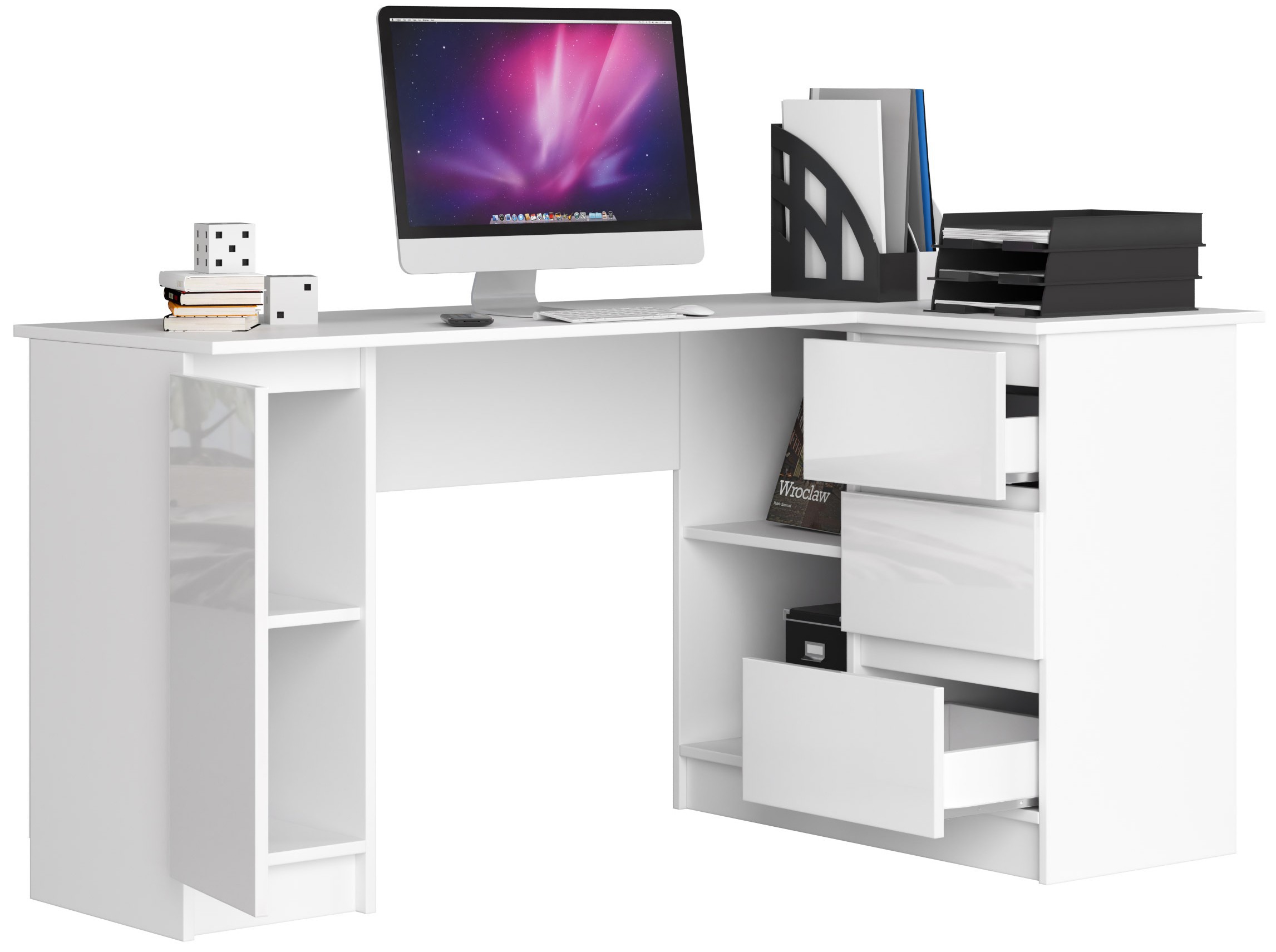 Pasirūpinkite savo darbo ar studijų erdvės kokybe. Tinkama vieta, kur galime ramiai dirbti, leis atsipalaiduoti ir susikaupti. Rašomasis stalas, kurį jums siūlome, yra elegancijos ir modernumo derinys. Kampinis stalas B20 CLP RIGHT 155CM, baltas GLOSS yra puikus produktas, kurį galima įsigyti už patrauklią kainą. Kodėl verta pirkti ir kuo jie skiriasi nuo kitų gaminių? – darbo kokybė yra neabejotinas šios įmonės gaminių privalumas; – rūpinkitės gamyboje naudojamomis aukštos kokybės medžiagomis – pagaminta iš 16 mm laminuotos plokštės Kronospan, atsparios trinčiai; – stalčių fasadai pagaminti iš AKRYL MDF plokštės su aukščiausiu blizgumo standartu, lengvai montuojami išlaikyti švarą; – viršuje yra daug vietos, kurią galima išdėstyti pagal savo idėją; – lentynos labai erdvios, ant jų galite sudėti daugybę knygų, aplankų ar segtuvų ; – stalčių naudojimą palaiko ritininiai kreiptuvai, kuriais stalčiai juda ; – ABS ratlankis garantuoja atsparumą pažeidimams gaminio kraštuose; – gamintojas pateikia 24 m. mėnesio garantija produktas; – stalas paruoštas savaiminiam surinkimui, o tai labai paprasta. STALO MATMENYS: Ilgis – 155 cm Aukštis – 77 cm Gylis – 85 cm