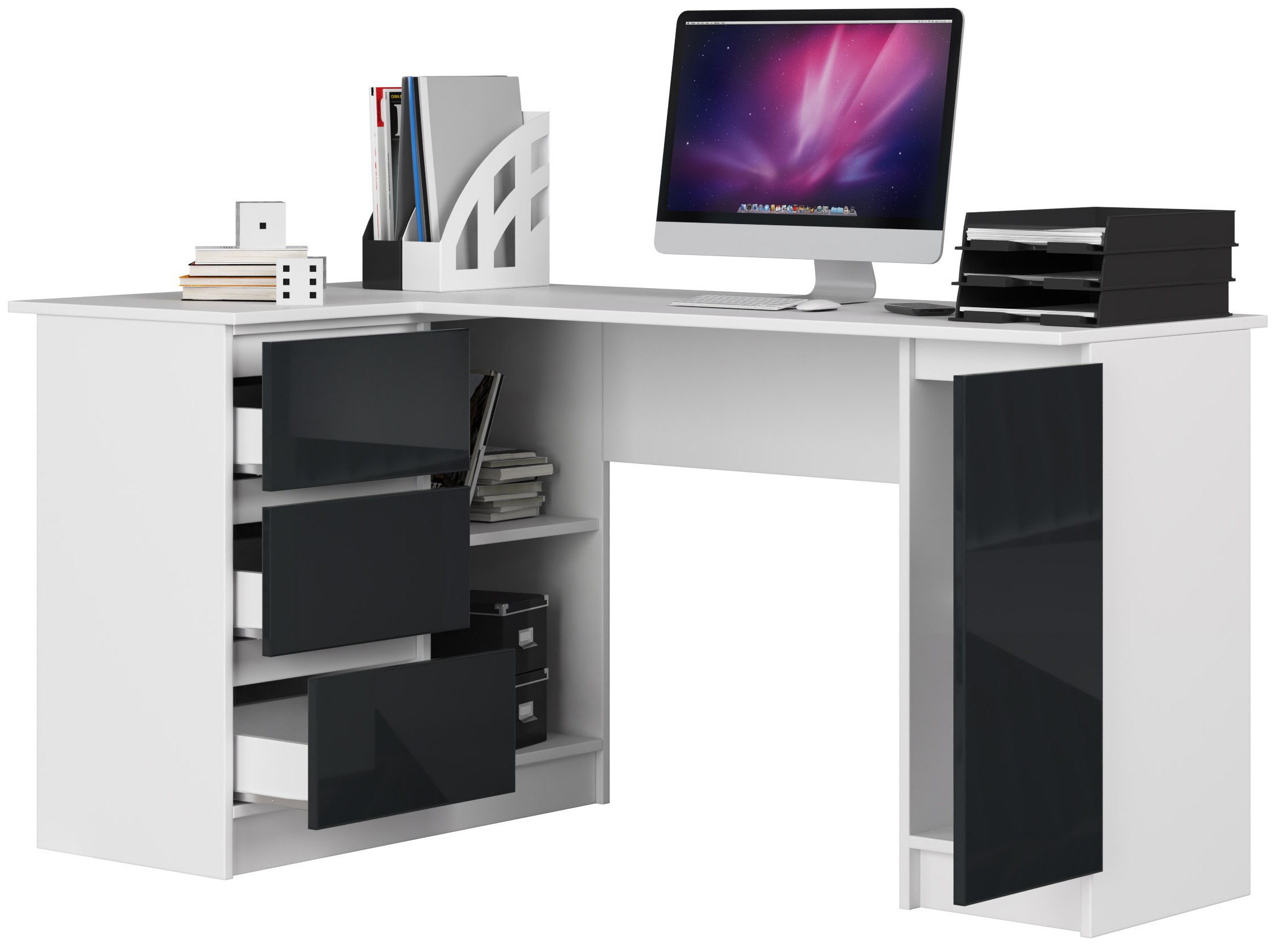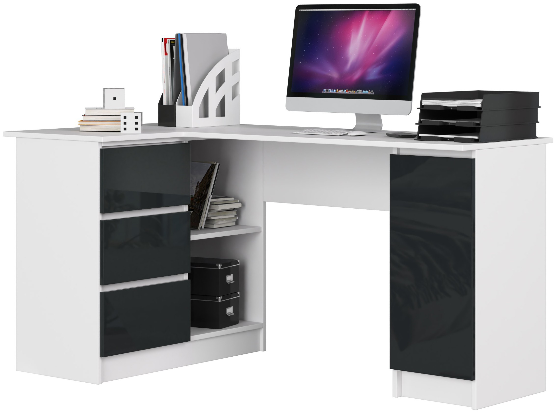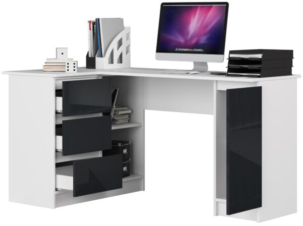 Ar norite sukurti savo darbo erdvę? O gal jūsų vaikas turėtų turėti daugiau erdvės ramiai mokytis? Puikus gaminys, kuris tiks ir vaikų kambaryje, ir biure – KAMPINIS RAŠAS B20 CLP KAIRINIS 155CM GLOBUS GRAFITAS. Tai labai modernus kairysis kompiuterio stalas su stalčiais ir B20 spintele. Šis gaminys pagamintas dėmesingai kiekvienai smulkmenai, išsiskiria keletu privalumų, kuriuos verta paminėti: – derinamos dvi labai madingos spalvos – korpusas, baltas matinis, priekis juodas blizgus; – rašomasis stalas pagamintas iš 16 mm dilimui atsparios laminuotos plokštės; – stalčių fasadai pagaminti iš AKRYL MDF plokštės su aukščiausio blizgumo standartu, labai lengva valyti – stalčiai juda ant metalinių ritinėlių kreiptuvų; – gaminys pasižymi dideliu funkcionalumu – turi daug laisvos erdvės savarankiškam vystymuisi, bet taip pat galimybė tilpti didelius daiktus, pvz., segtuvus; – matomi kraštai padengti ABS briauna, padidintu atsparumu pažeidimams ; – turi 3 erdvius stalčius; Rašomasis stalas paruoštas savarankiškam surinkimui, o tai labai paprasta, pakuotėje yra aiški naudojimo instrukcija ir 24 mėnesių garantija. Labai funkcionalūs matmenys: Ilgis – 155 cm Aukštis – 77 cm Gylis – 85 cm Svoris – 60 kg