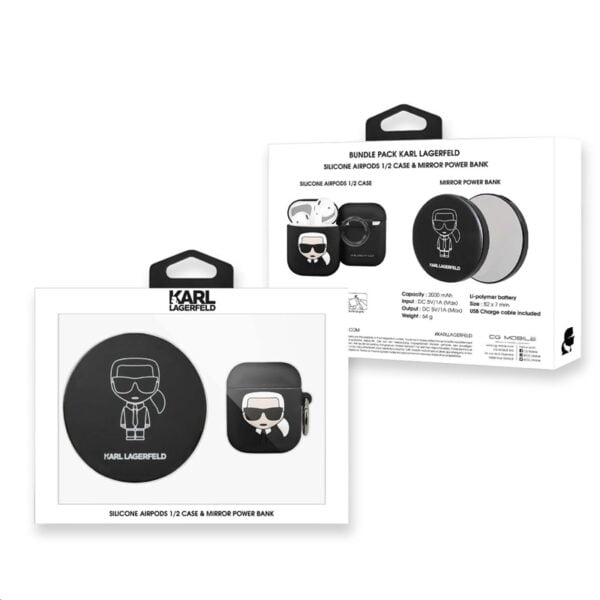 Karl Lagerfeld Bundle Ikonik – dėklų rinkinys Apple Airpods 1/2 + Power Bank su veidrodžiu