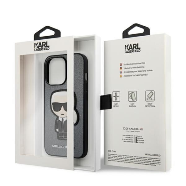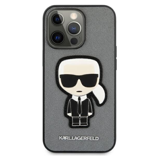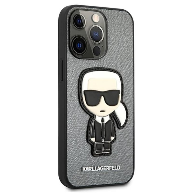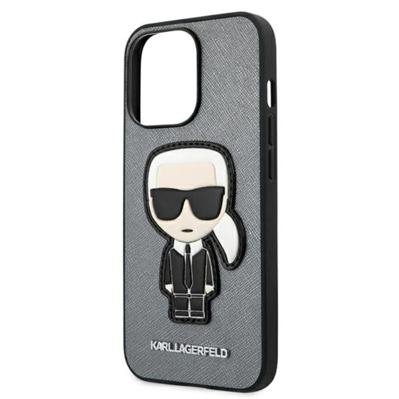 Karl Lagerfeld Saffiano Ikonik Patch – dėklas, skirtas iPhone 13 Pro Max (sidabras)