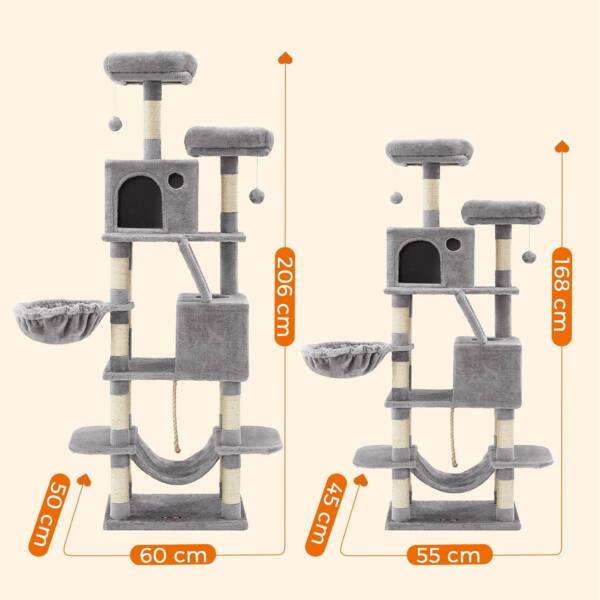Visos pramogos: Su 2 pomponais, žaidimų virve, 2 urvais, krepšiu ir hamaku jūsų katėms niekada nebus nuobodu ant šio draskymo stulpelio.