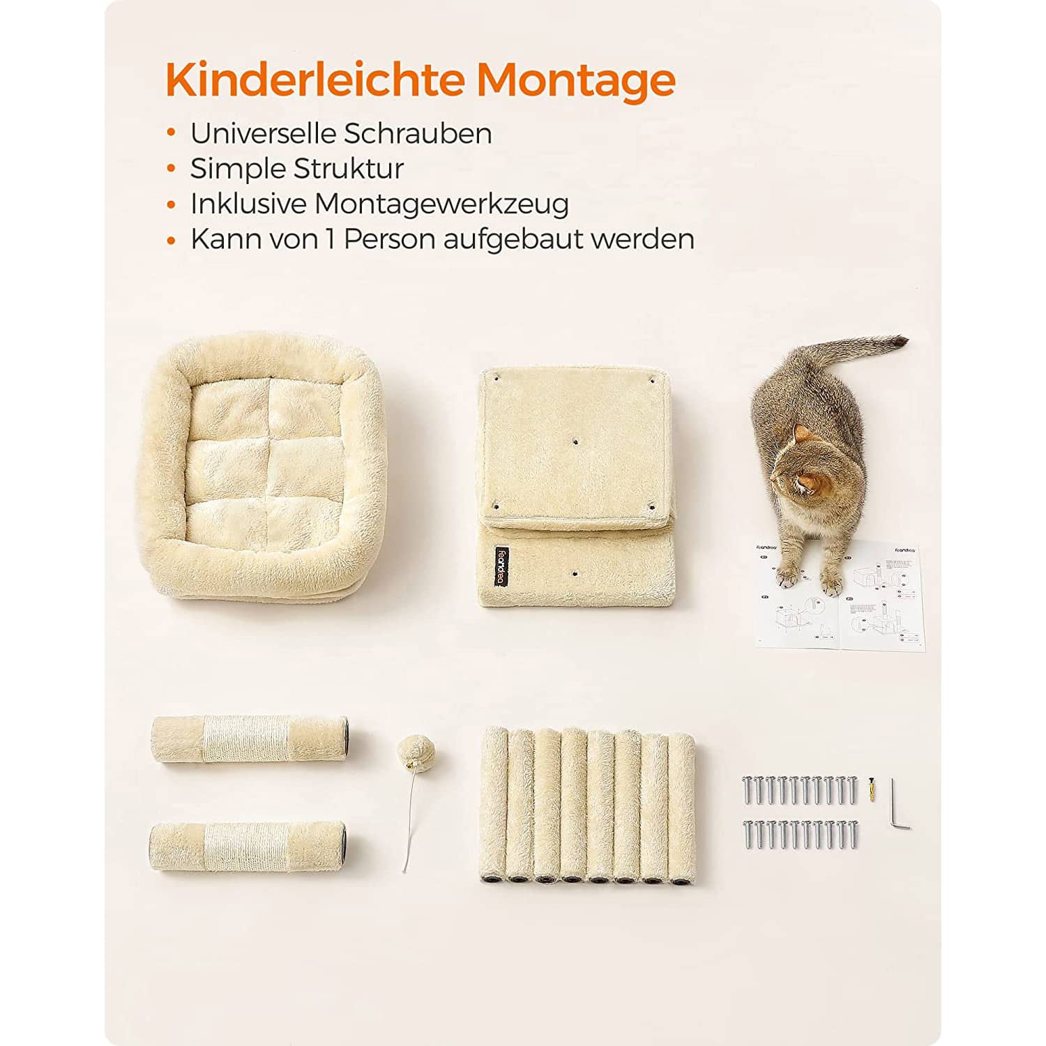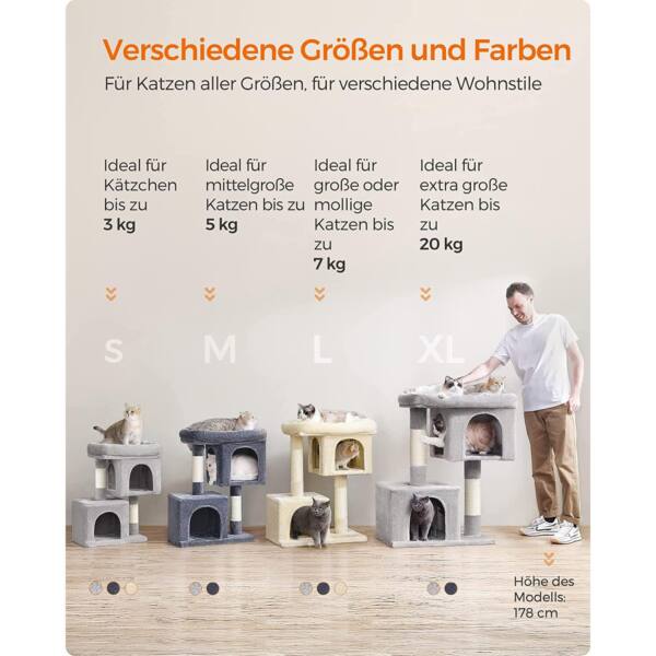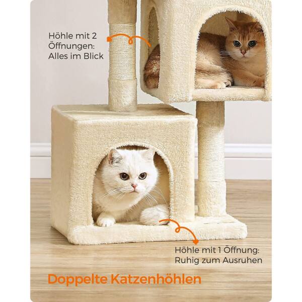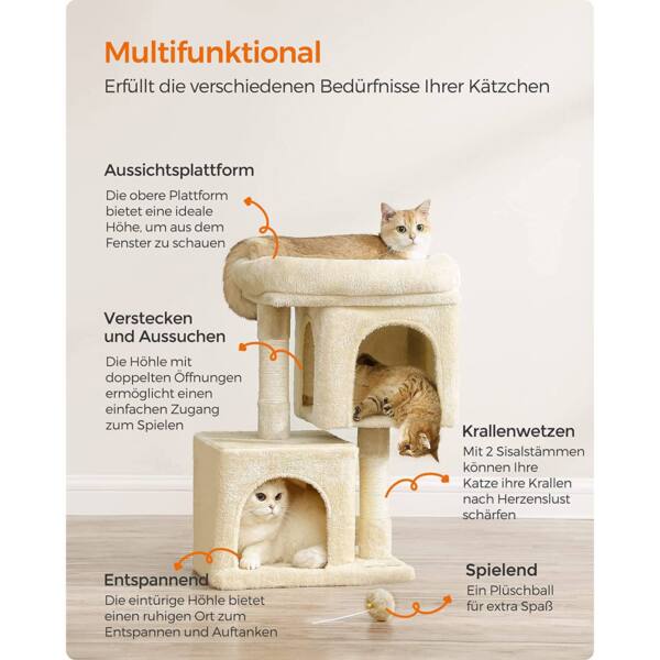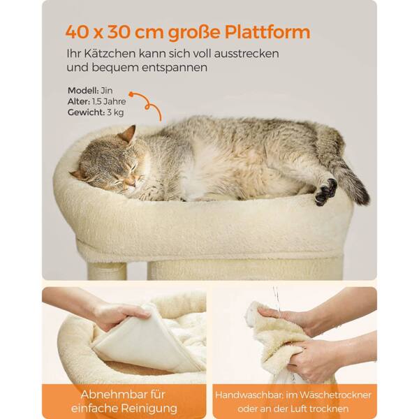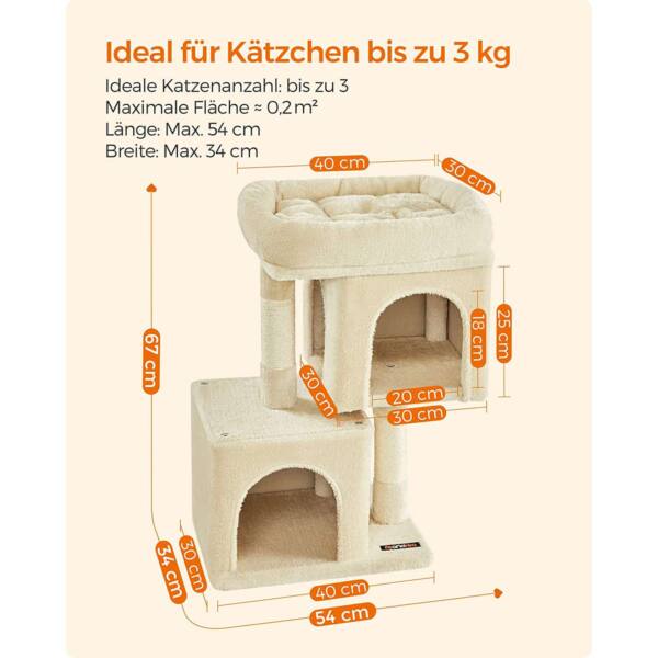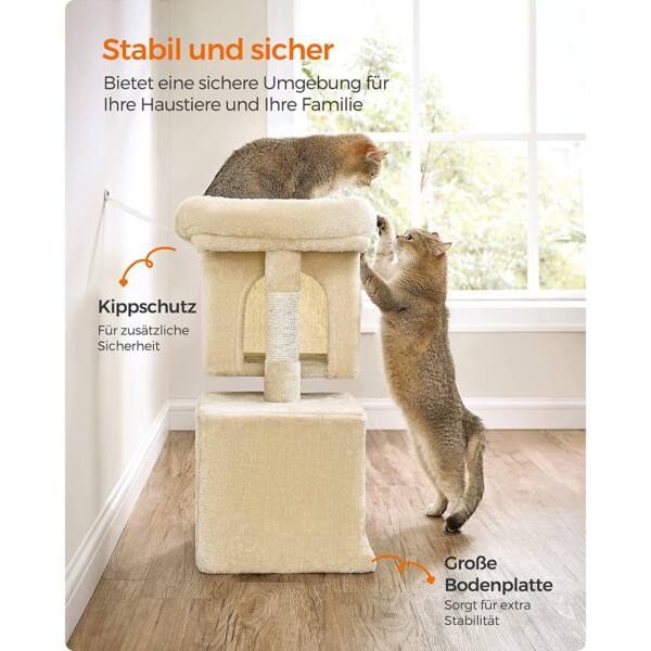Draskyklė yra smėlio spalvos, todėl lengvai derės prie bet kokio interjero. Pagaminta iš kokybiškų medžiagų, tokių kaip medžio drožlių plokštė (MDP), pliušas ir sizalis, užtikrinančių ilgaamžiškumą ir patogumą jūsų katei.