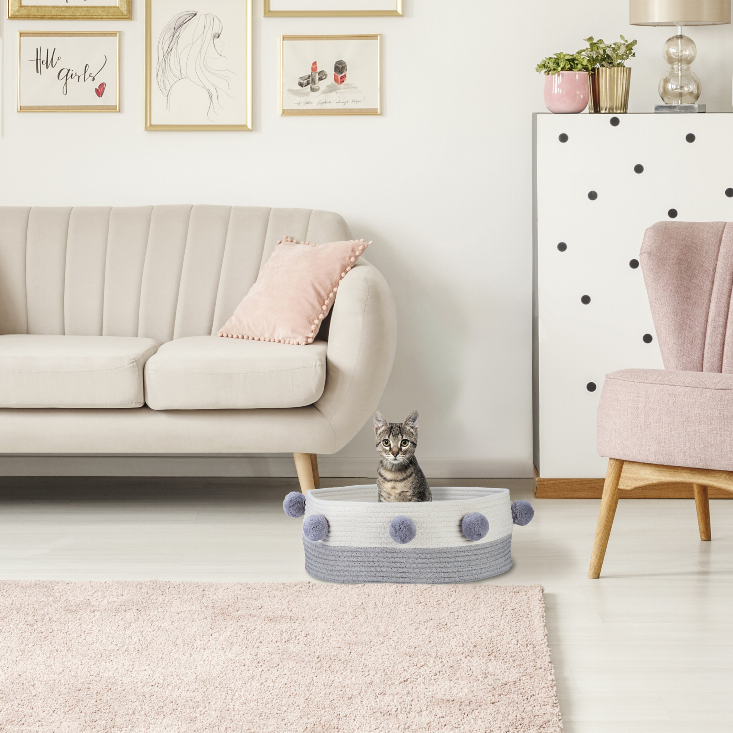 - Jaukumas ir saugumas: Aukštas kraštas suteikia jūsų katei galimybę atsipalaiduoti ir jaustis saugiai, o pomponai skatina bendrauti ir žaisti.