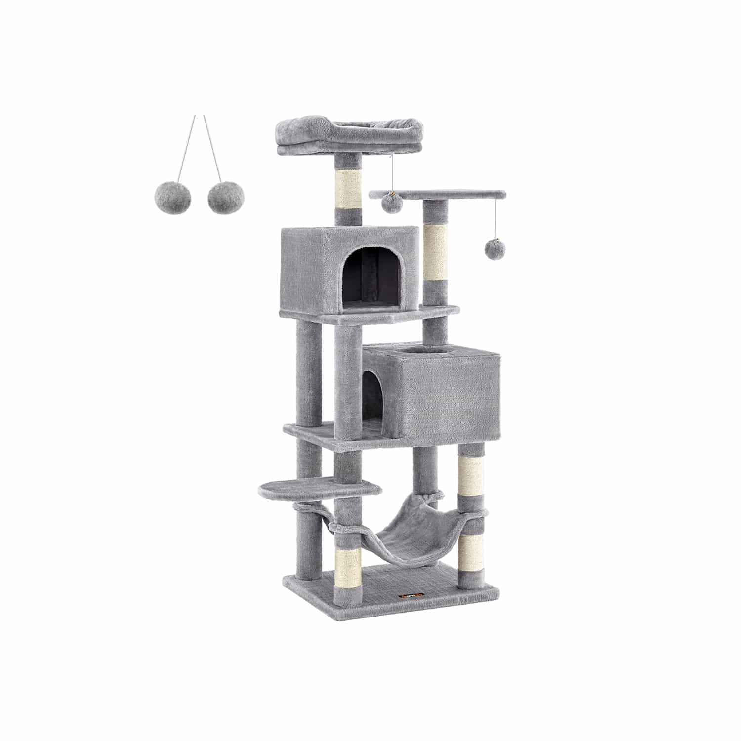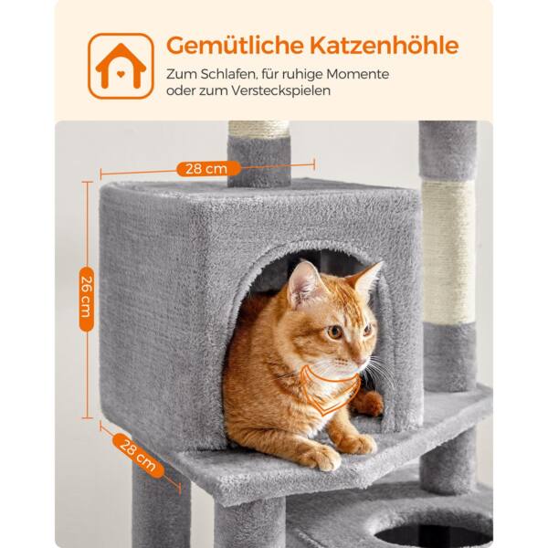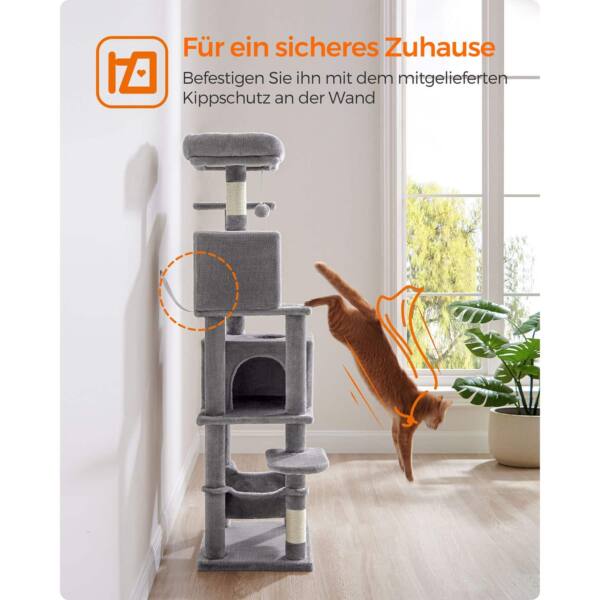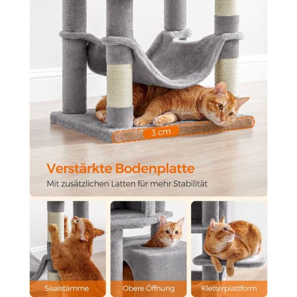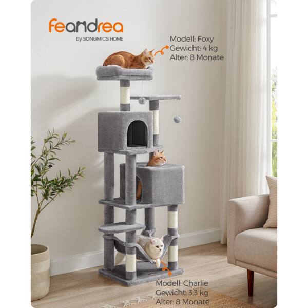 Šis šviesiai pilkas katės medis yra puikus pasirinkimas jūsų augintiniui. Pagamintas iš kokybiškos medžio drožlių plokštė (MDP) , pliušo ir sizalio, jis užtikrina ilgaamžiškumą ir patogumą jūsų katei.