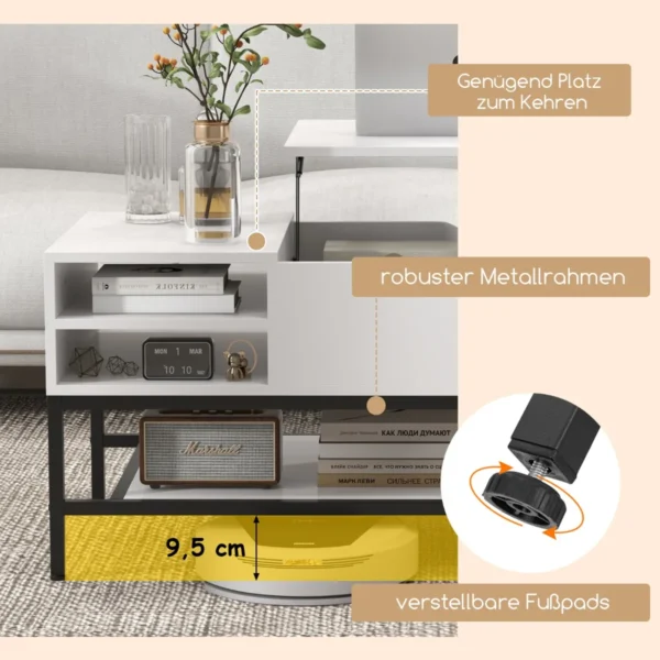 Kavos staliukas 100×49,5×47,5 cm baltos ir juodos spalvos puikiai tinka svetainės erdvei. Su pakeliamu stalviršiu jis transformuojasi į darbo ar valgomąją zoną, taip suteikdamas funkcionalumo ir papildomos vietos daiktams laikyti.