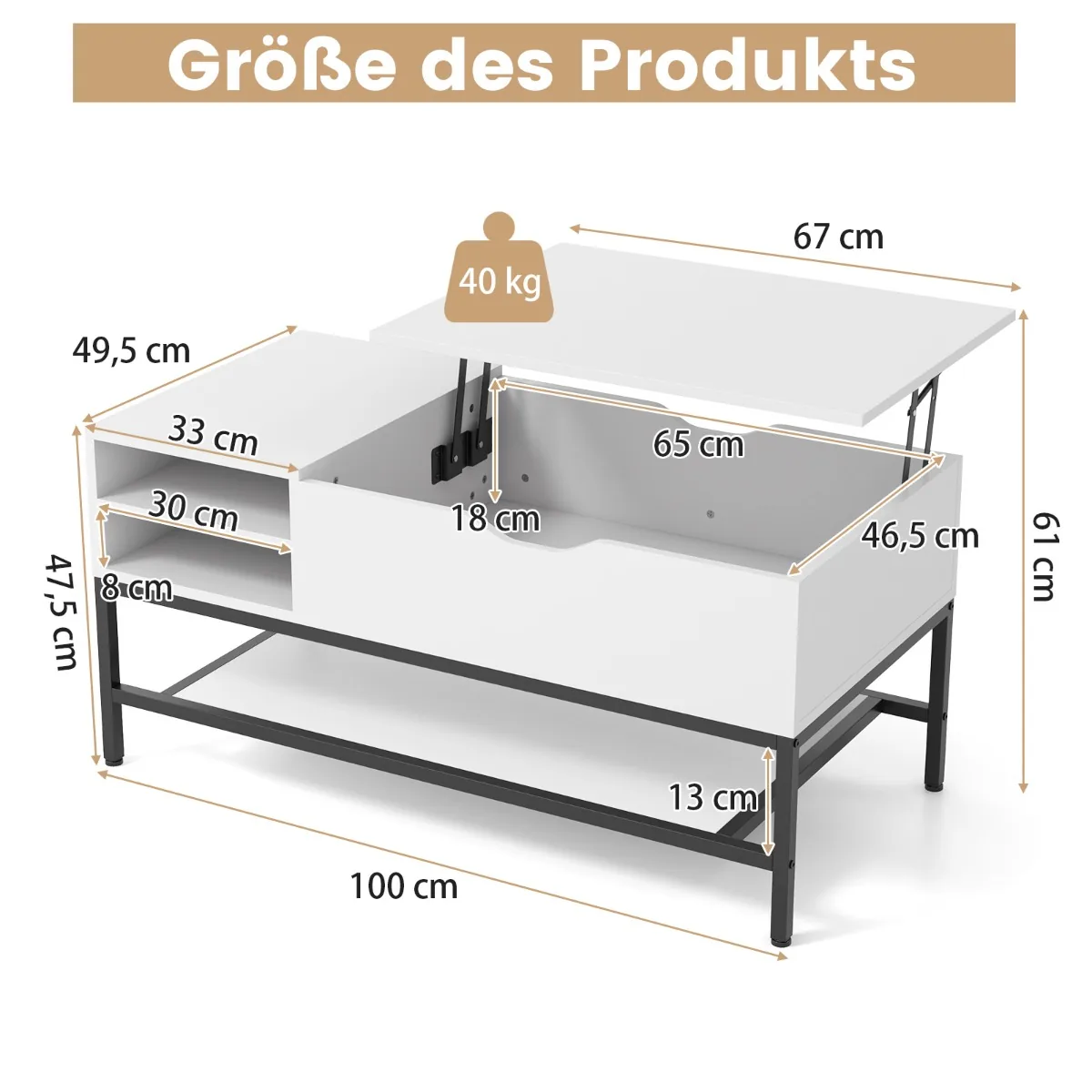 - Bendri išmatavimai pakėlus stalviršį: 100 x 49,5 x 61 cm (I x P x A)