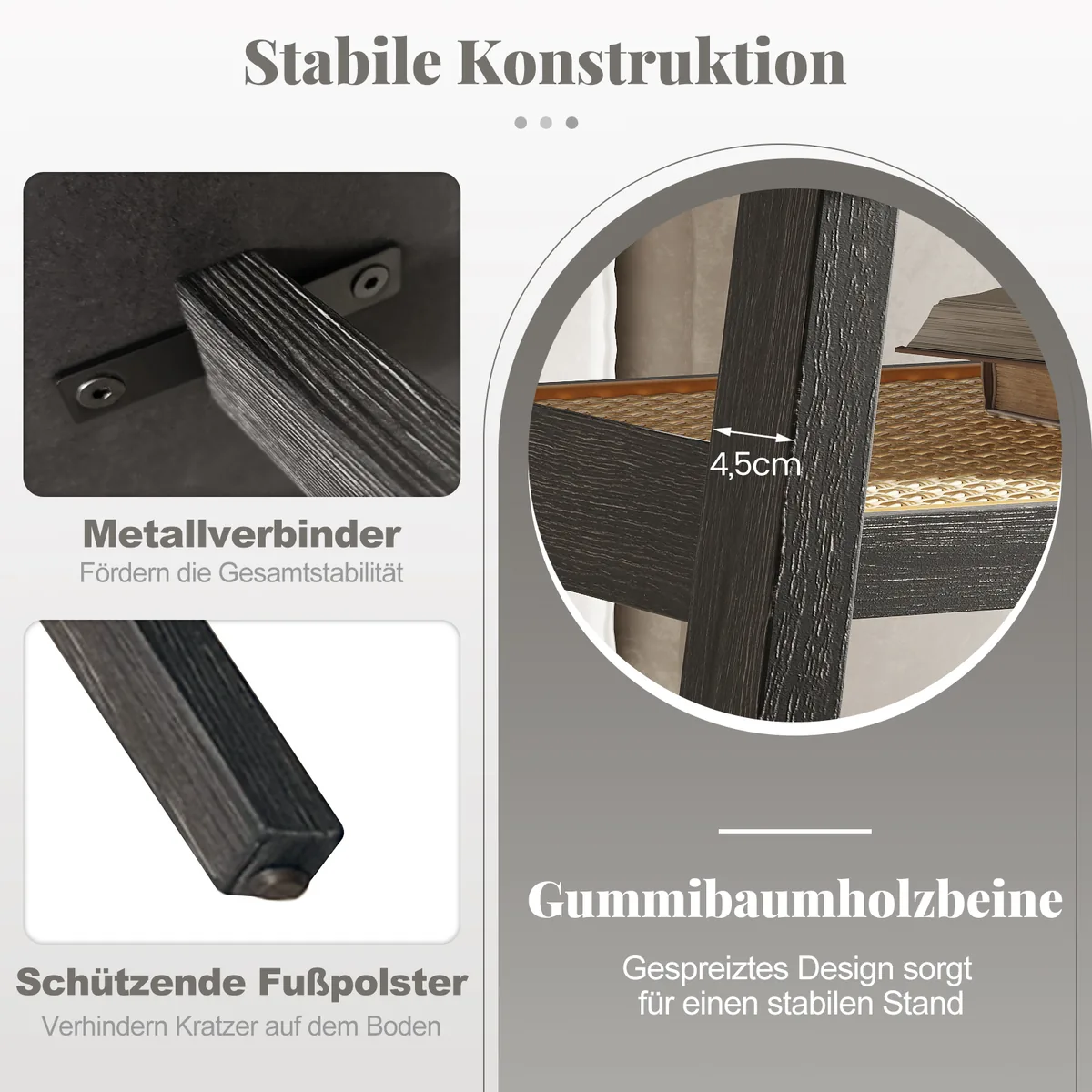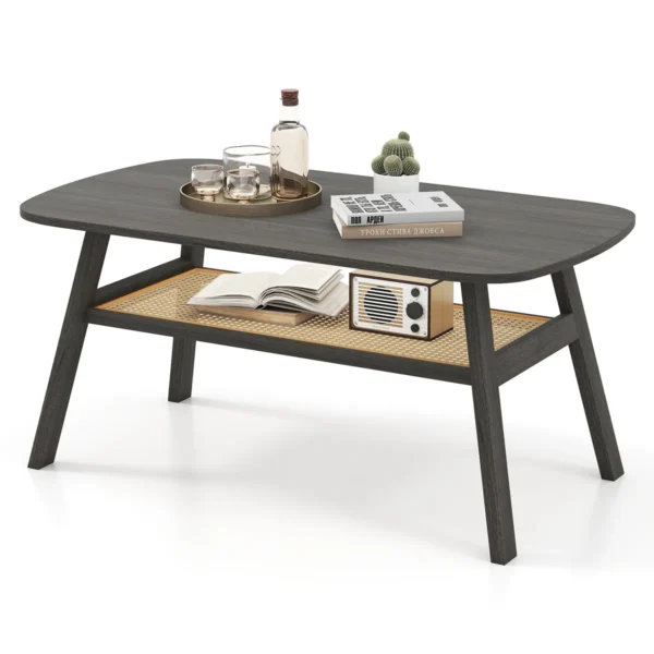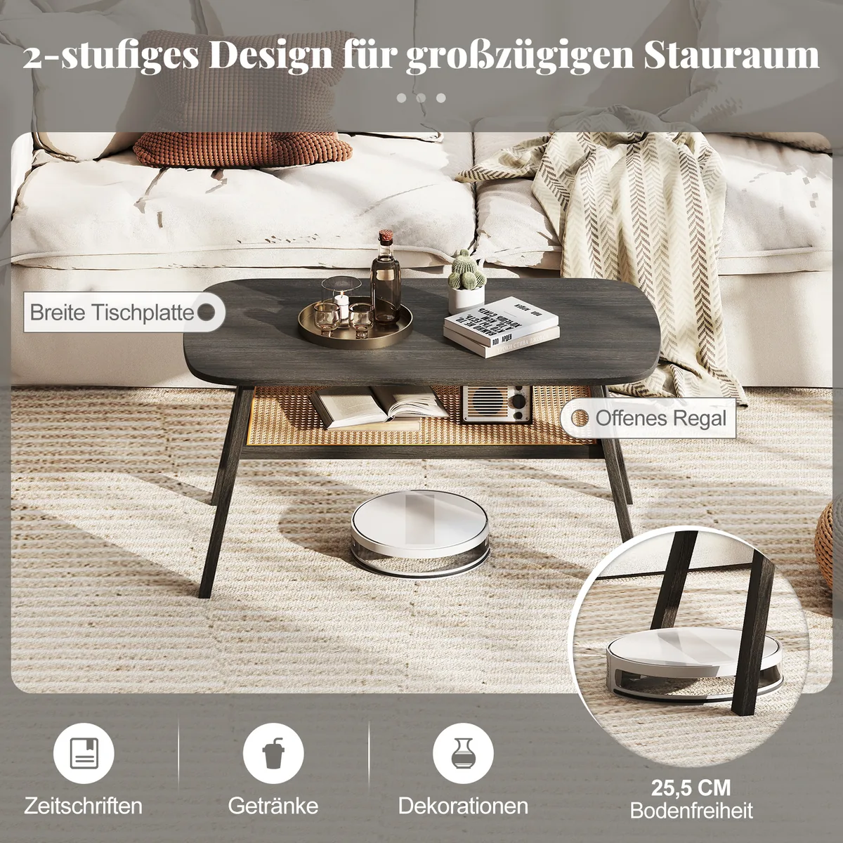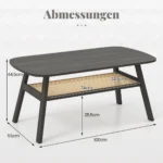 Kavos staliukas 100x55x44,5 cm tamsiai rudos spalvos yra funkcionalus sprendimas jūsų svetainei ar kitiems kambariams. Pagamintas iš guminės medienos masyvo su PE rotango detalėmis, jis pasižymi patvaria konstrukcija ir praktiška saugojimo erdve.