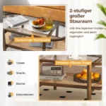Kavos staliukas 102x56x47cm., rudos spalvos – funkcionalus ir praktiškas sprendimas jūsų svetainei ar biurui. Pagamintas iš tvirto akacijos medžio, grūdinto stiklo ir PE rotango, šis 2 pakopų staliukas užtikrina patikimą laikymo vietą ir patogų naudojimą kasdienėje erdvėje.