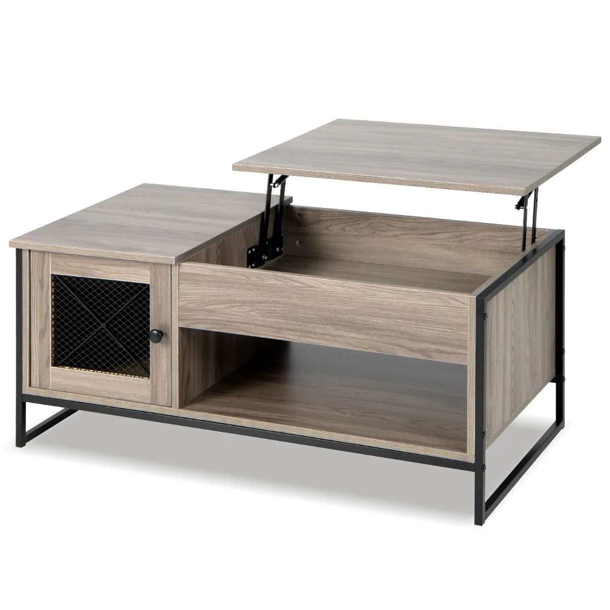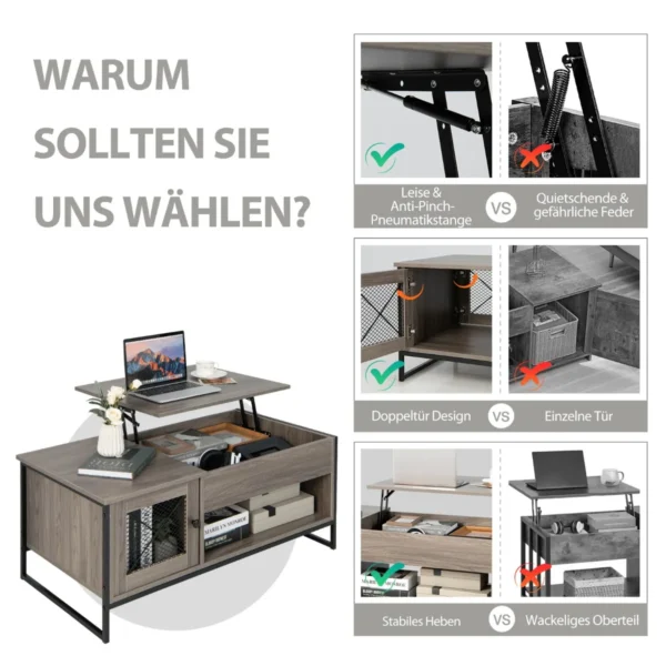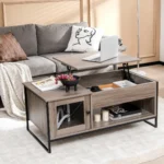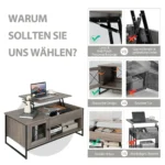 Kavos staliukas 104x55x58cm, pilkos ir juodos spalvos, puikiai tinka įvairiems svetainės ar darbo erdvės poreikiams. Su pakeliamu stalviršiu ir erdvia saugykla, jis suteikia patogumą bei funkcionalumą kiekviename kambaryje.