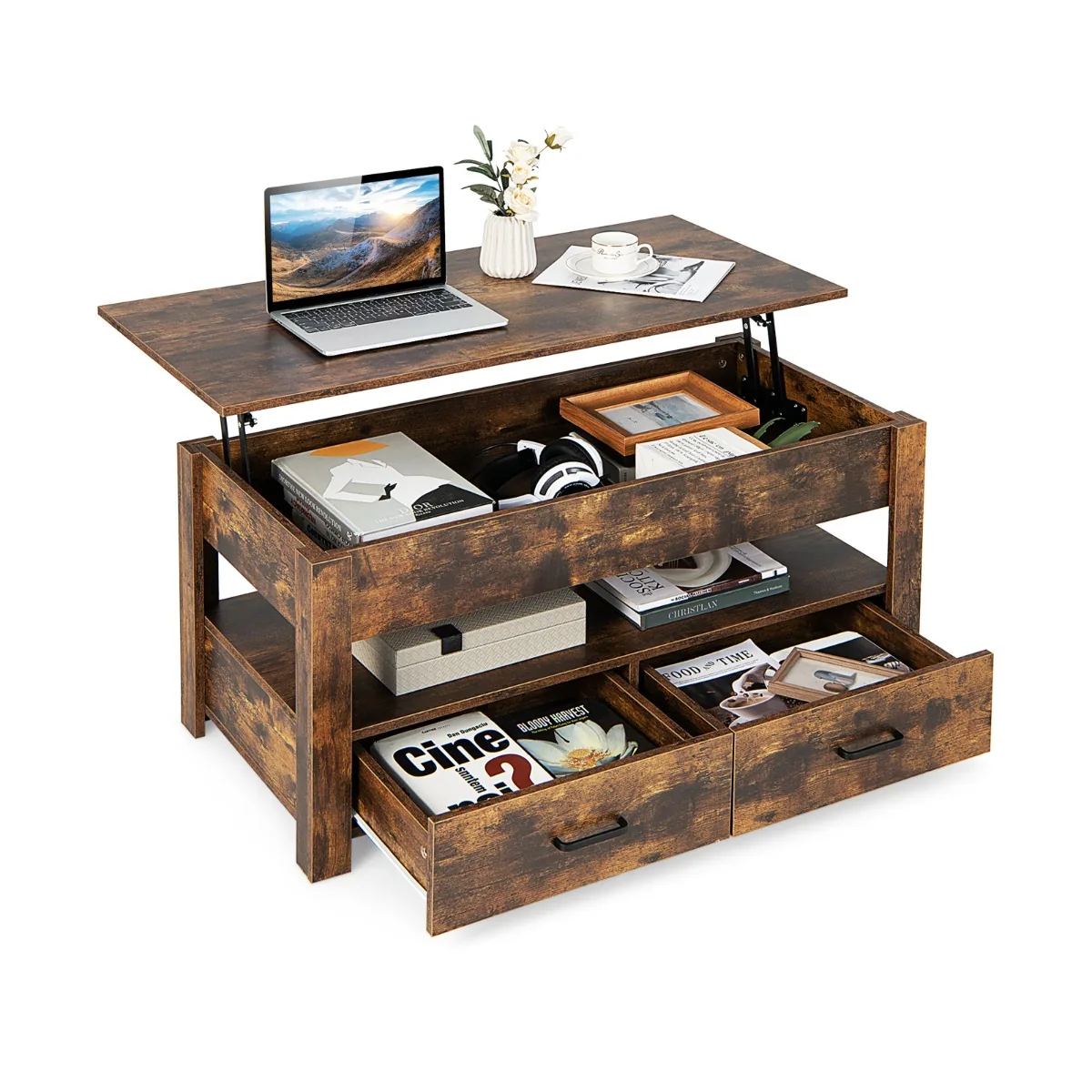 Kavos staliukas 106x50x46,5cm rudos spalvos – funkcionalus ir patogus sprendimas jaukiam svetainės ar poilsio kambario interjerui. Staliukas turi pakeliamą stalviršį su pneumatinėmis kėlimo strypais, leidžiančiu patogiai naudotis ir pasiekti daiktus. Papildomos lentynos ir stalčiai užtikrina tvarką ir tinkamą erdvės išnaudojimą.
